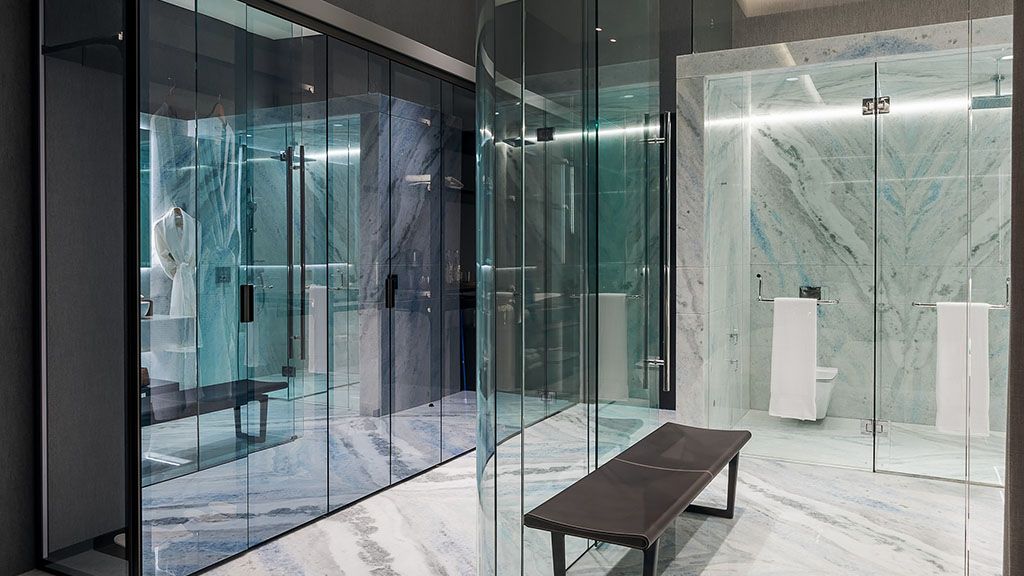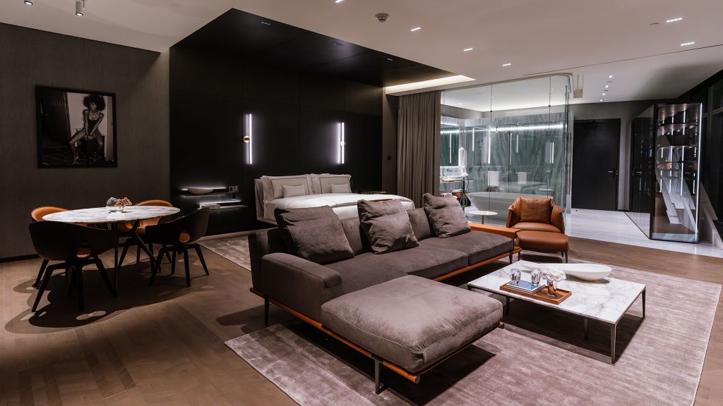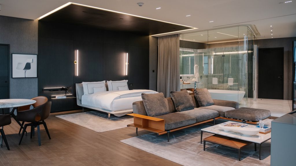 An expansive, comfortable, and aesthetic open floor plan includes a sumptuous bathroom with a stand-alone bathtub and rain shower, a dining room, a living area, and an unforgettable bed. Each suites features Poltrona Frau furniture, Rimadesio closets, Open living and dining area, King-size bed, Floor-to-ceiling windows, Bang & Olufsen speakers, Lutron Lighting control system, Nespresso coffee maker, Byredo bath & shower amenities, Complimentary minibar, Dyson hairdryer, 600-thread count linens.