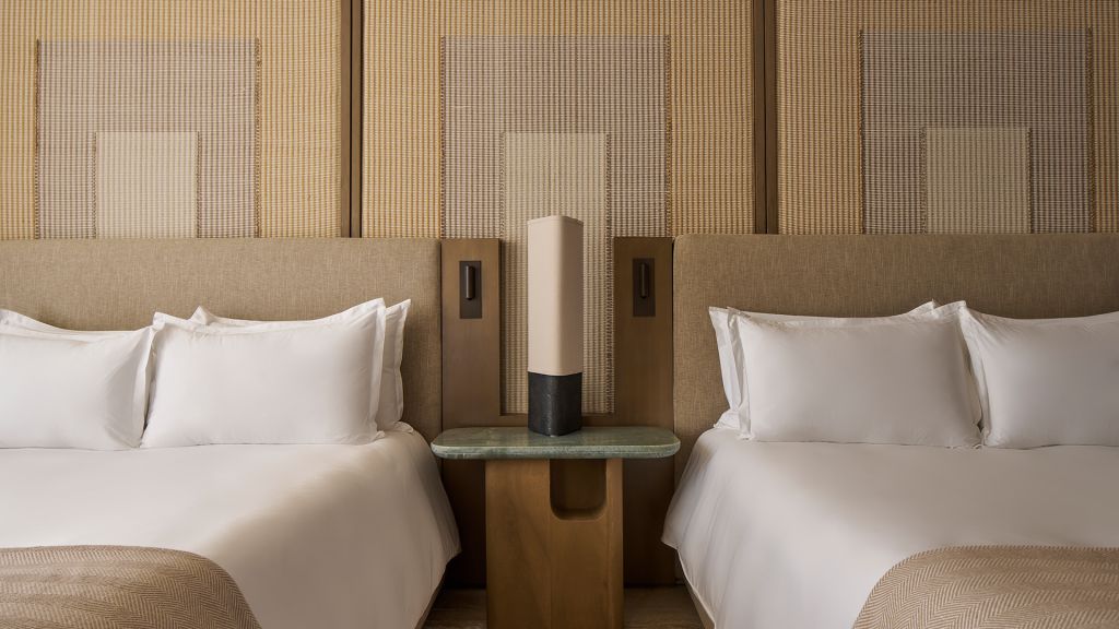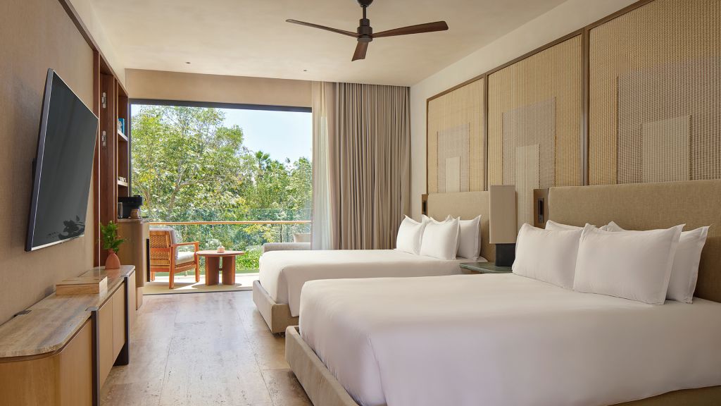 Take in the tropical garden views from your private balcony or retreat into your tranquil 538-square-foot room, furnished in soothing colors from nature, with two double beds, a rainfall shower and luxe amenities.