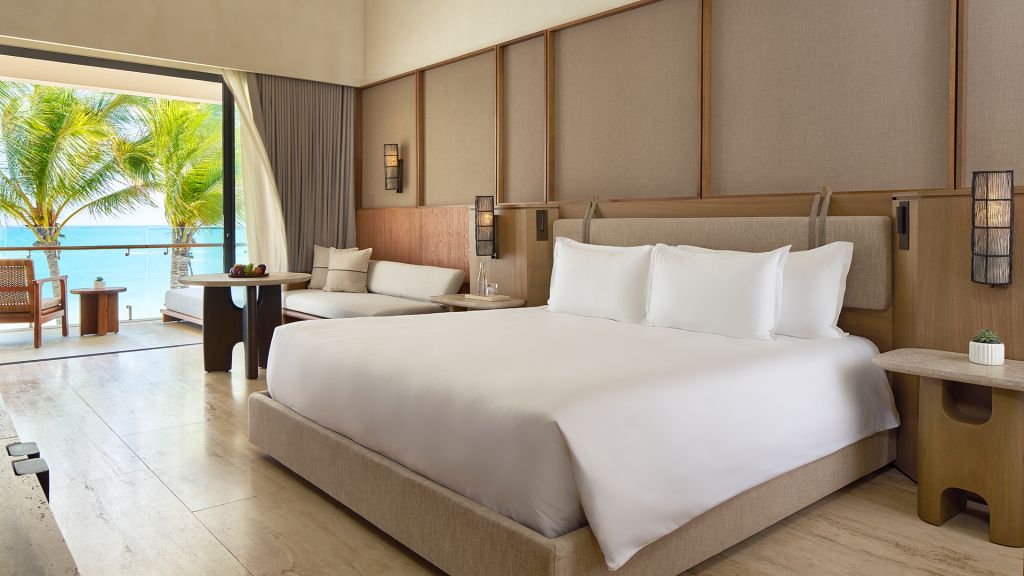 Sleep by the sea in your spacious 1,107-square-foot suite, with a king bed, a private balcony with a plunge pool, ocean or beachfront views, a rainfall shower in the plush bathroom, a separate living area and a long list of comforting amenities.
