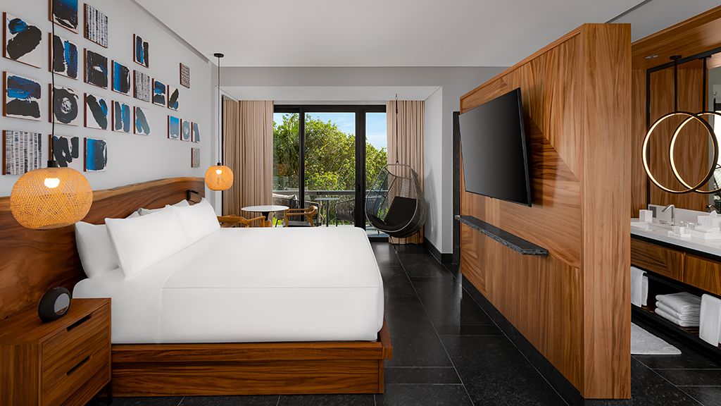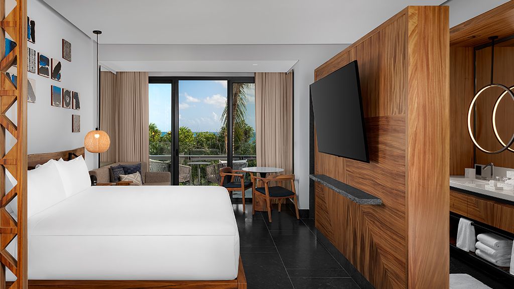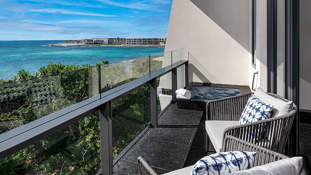 Room with king bed, beach access, balcony with relaxation tub for two, sitting area and bathroom with spa-like bath, double vanity and oversized shower.