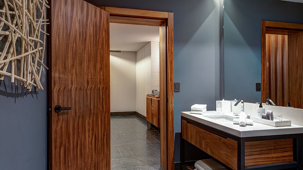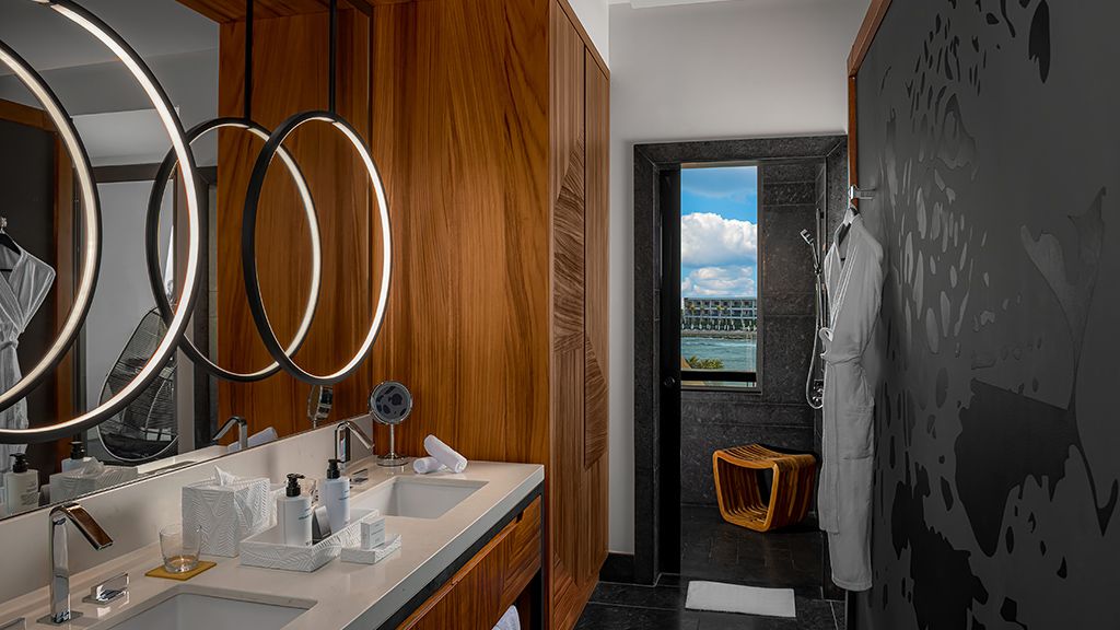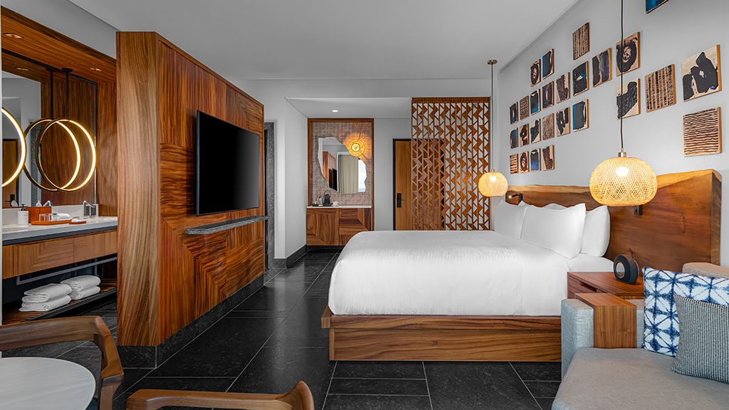 Room with king bed, balcony, plunge pool, sitting area and bathroom with spa-like bath, double vanity and roll-in oversized shower.