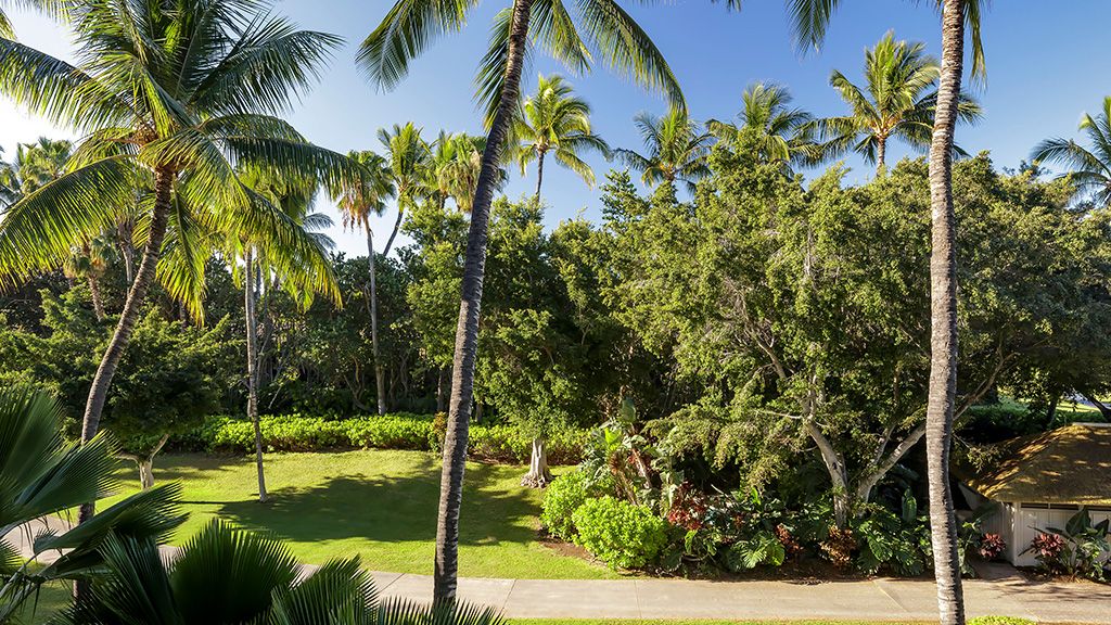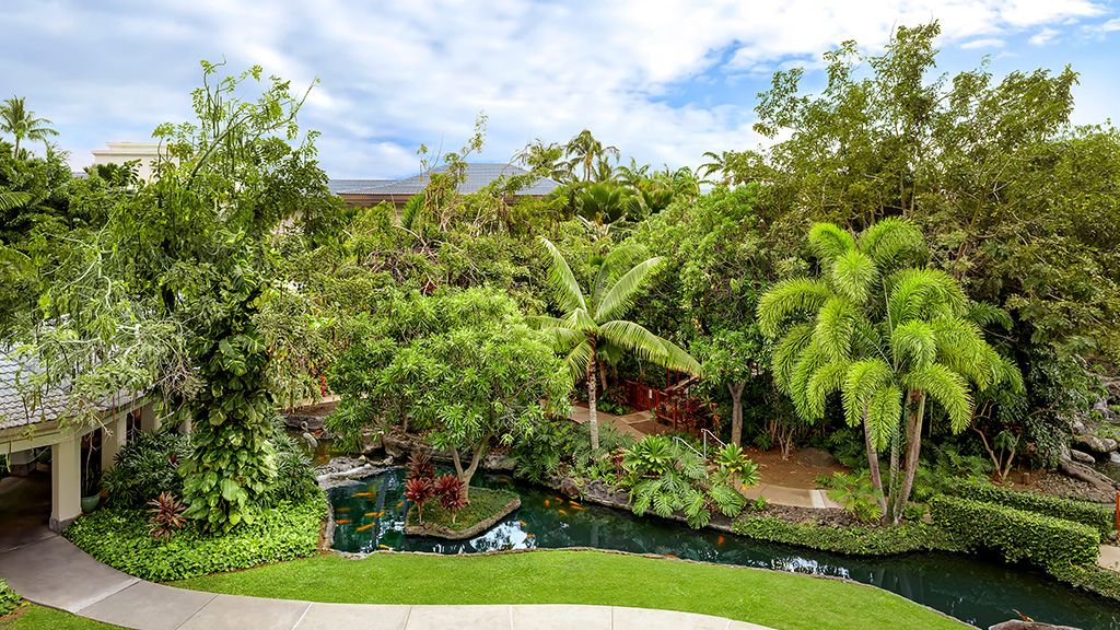 Queen/Queen, 522 SF/48 SM, tropical garden view.