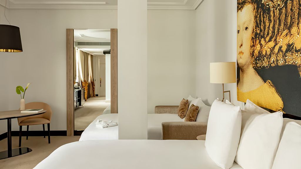 The perfect option for enjoying Madrid with the family in this superb and comfortable room. It features a small lounge with a sofa-bed for children and luxury details to ensure the comfort of adults.