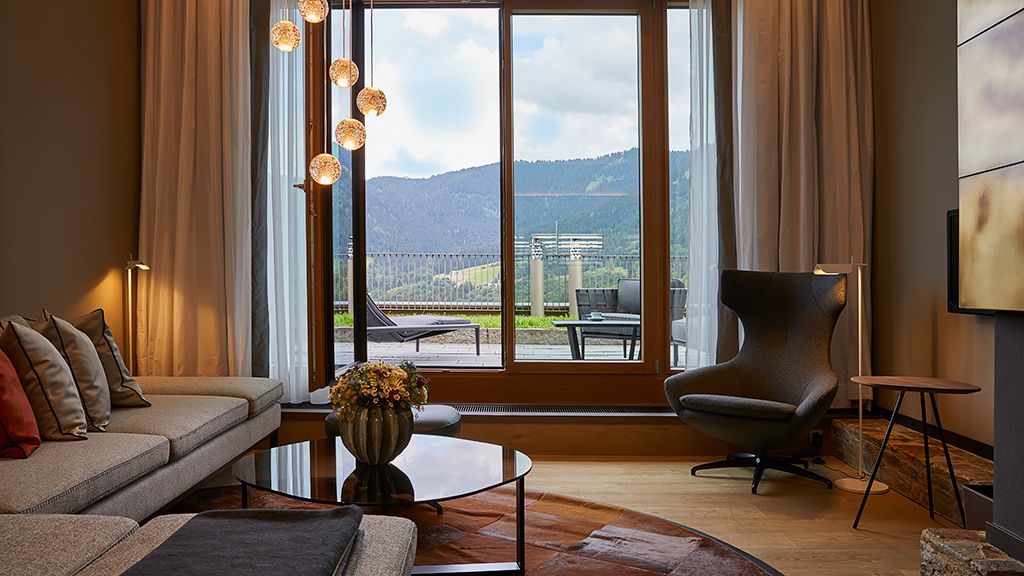 Panorama suite - scenic valley view over forest covered hills (east side) or mountain view (west side), located on the 2nd and 3rd floor. Separate living room with lounge area and fireplace. Flatscreen tv, laptop-size safe, tea & coffee making facilities, selection of pillows, minibar and complimentary standard wi-fi. Bathroom with bathtub and rain shower, separate wc. Connecting room possible. Max. Occupancy: 2 (including baby or children) - 75 sqm (807 sq. Ft.)