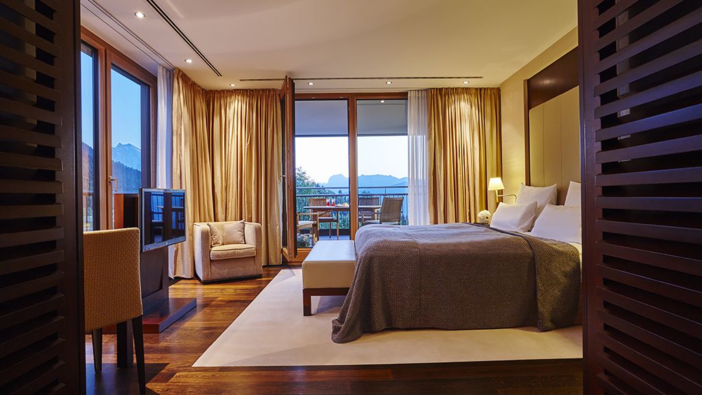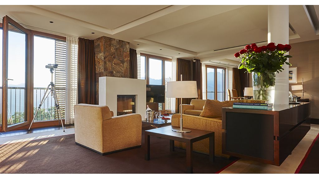 Scenic views to the east, south and west over the valley and mountains, located on the 3rd floor. Dining area for up to 10 guests, kitchenette, private balcony, walk-in closet, separate living room with lounge area and fireplace, guest wc, flatscreen tv, laptop-size safe, tea & coffee making facilities, minibar and complimentary standard wi-fi. Master bathroom with bathtub and rain shower, separate wc. Connecting room possible to a deluxe panorama view room. Max. Occupancy: 3 (including baby or children) - 175 sqm (1.884 sq. Ft.)