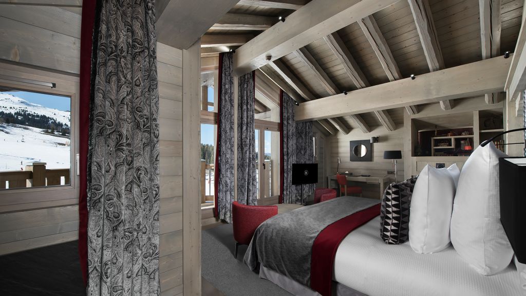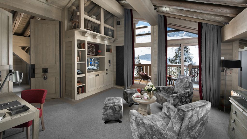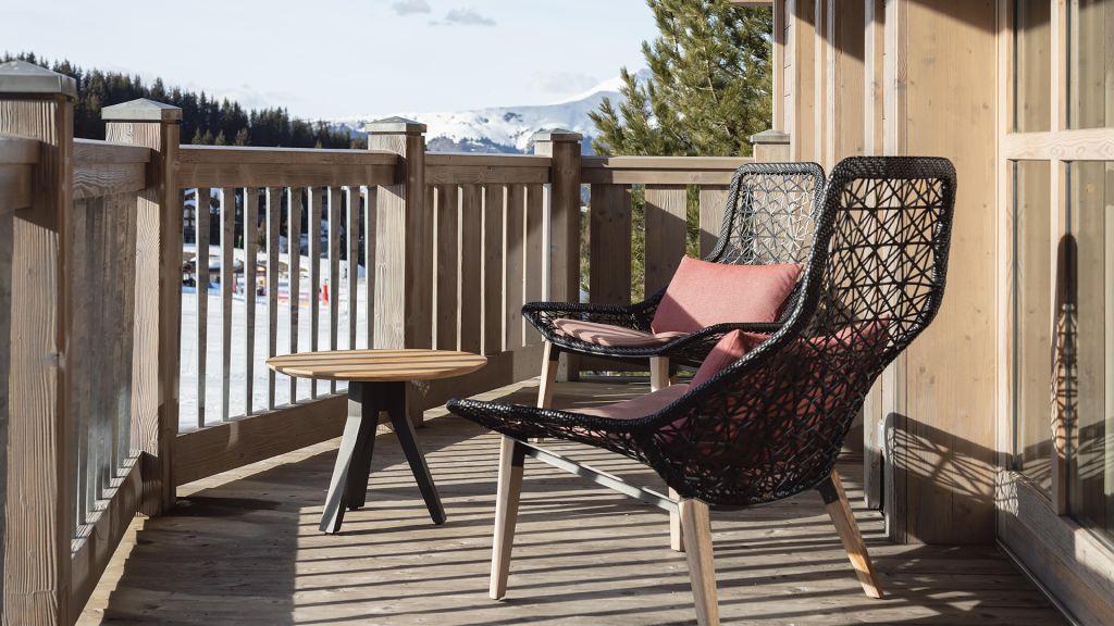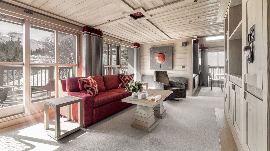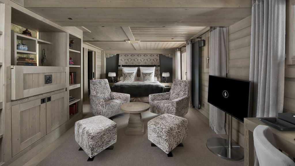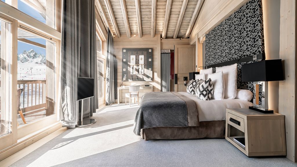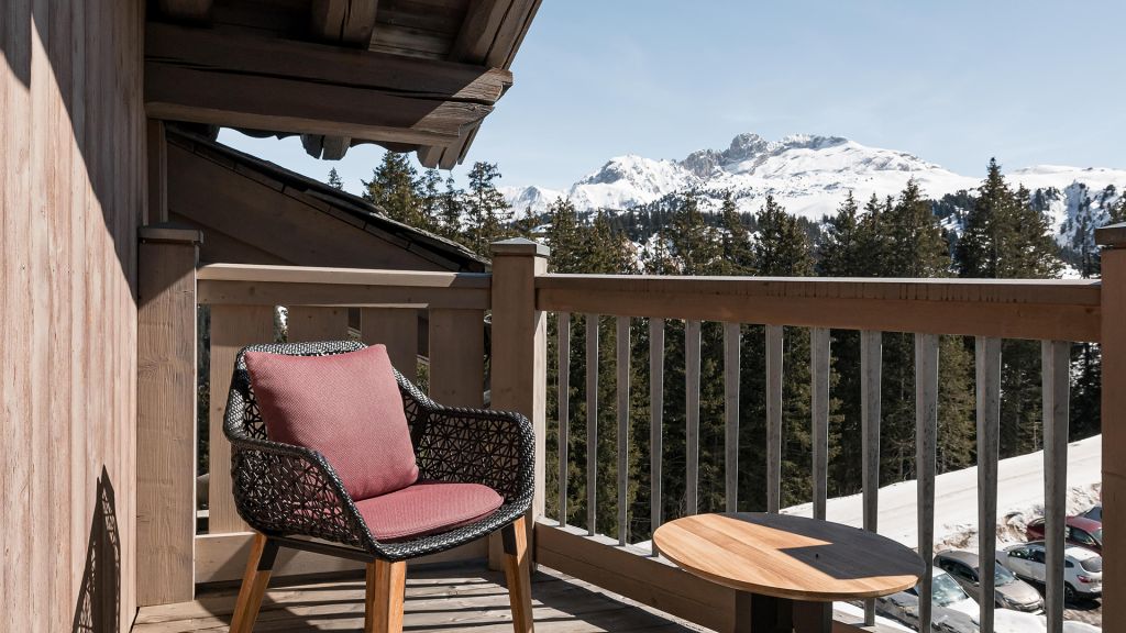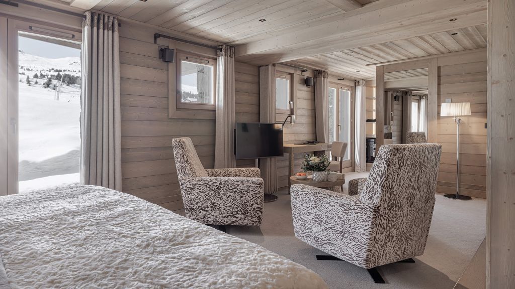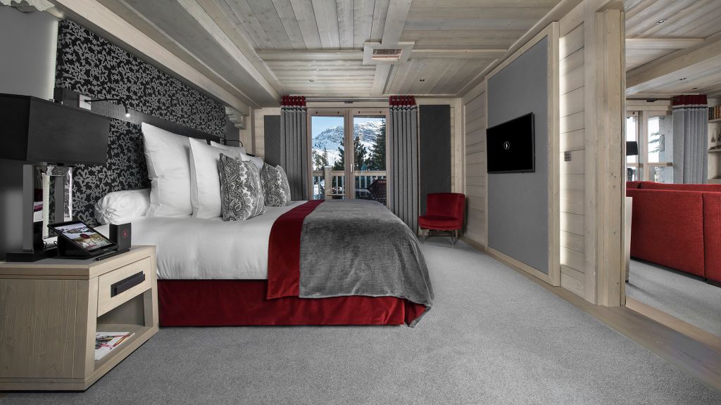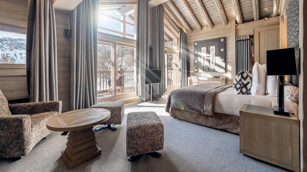 These 62 sqm suites are designed for guests seeking space and elegance. A separate bedroom features a king-size bed (convertible into twin beds), and the lounge includes a sofa, armchairs, coffee table and desk. The large bathroom is equipped with a walk-in shower and bathtub. Each suite benefits from ample storage, including a generous wardrobe or dressing area. A balcony opens onto unobstructed views of the slopes or surrounding mountains. Apple tv and a sonos sound system ensure refined entertainment.