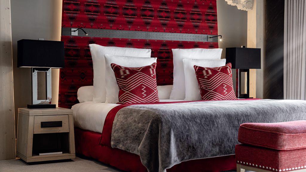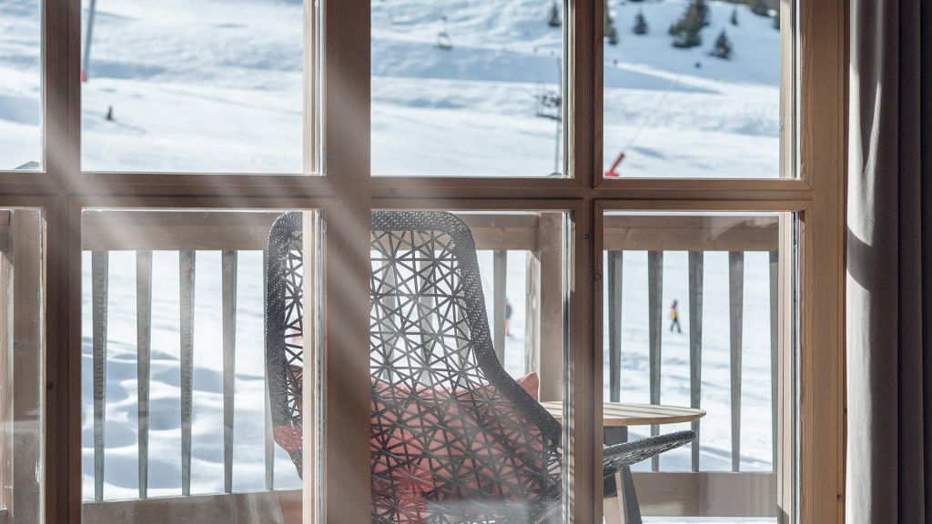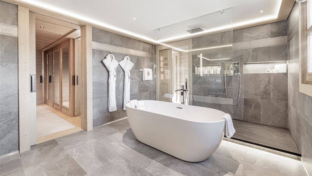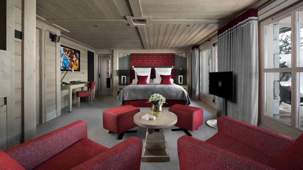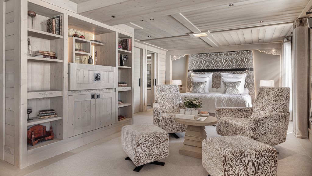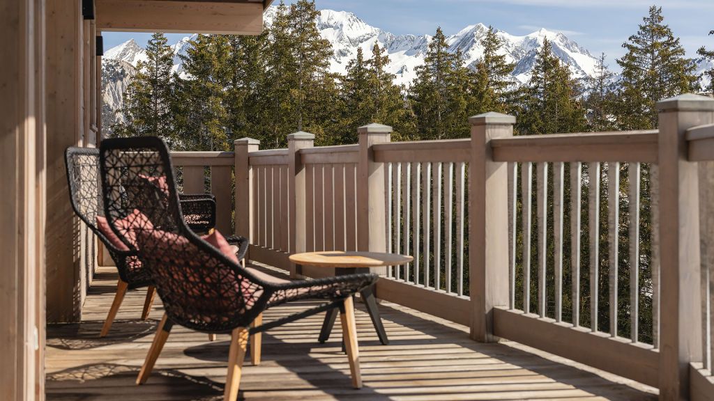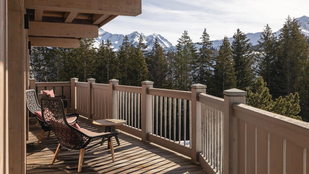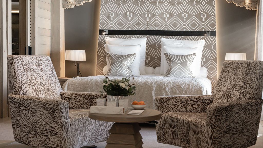 With generous proportions starting at 41 sqm, the superior room offers spacious elegance in a chalet-inspired décor in a himalayan setup. Each room features a king-size bed (convertible into twin beds), a lounge corner with armchairs and coffee table, a writing desk, and a bathroom with walk-in shower and bathtub. A private balcony opens onto stunning views of the mountains or ski slopes. Apple tv and sonos audio system provide entertainment in style.