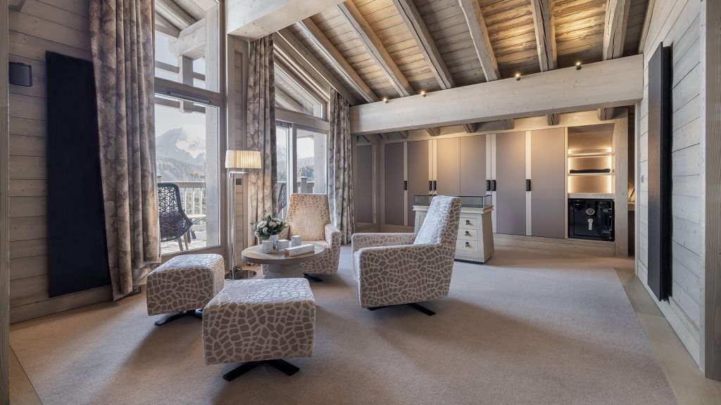 These junior suites, from 52 sqm, combine warmth and alpine sophistication. Each suite includes a king-size bed (convertible into twin beds), a spacious lounge area with sofa, armchairs, and coffee table, as well as a writing desk. The bathroom offers a walk-in shower and bathtub. A private balcony reveals views over the surrounding mountains or ski slopes. Apple tv and sonos sound system round out the suite’s amenities.