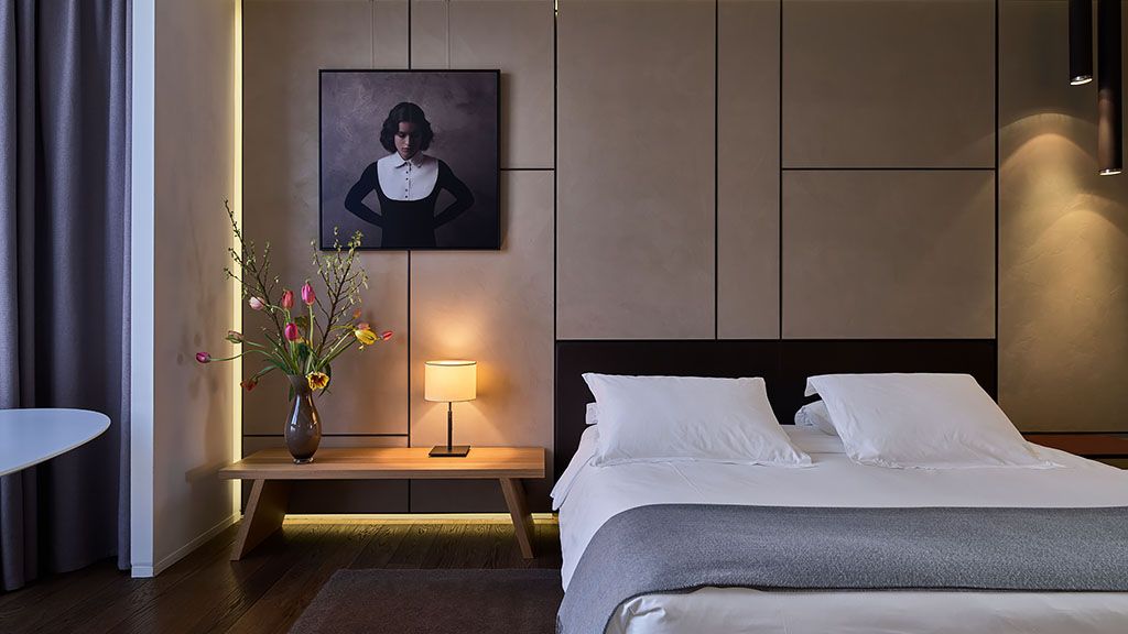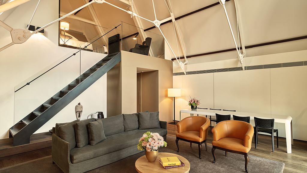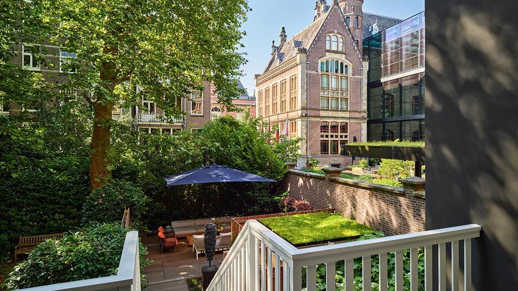 This two-bedroom suite features a private 70-square-metre garden and balcony views of the Stedelijk Museum. With 1 King & 2 Twin beds, separate living room, workspace, two bathrooms and art by Dutch artist Mart Visser, it offers an exceptional stay.