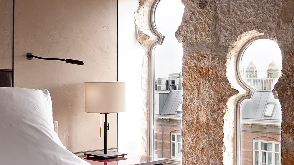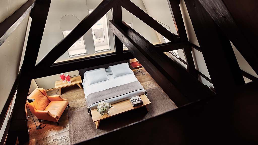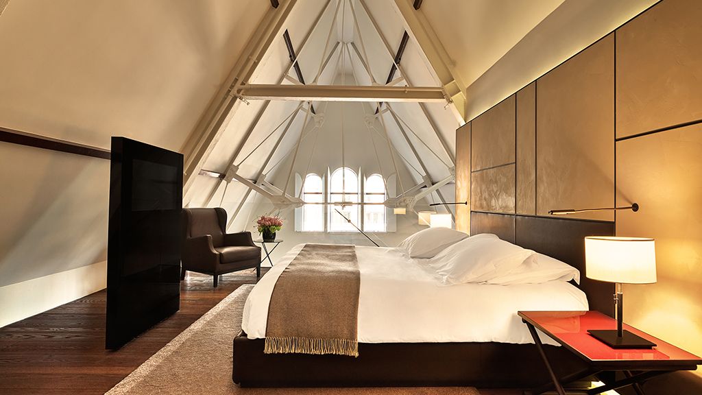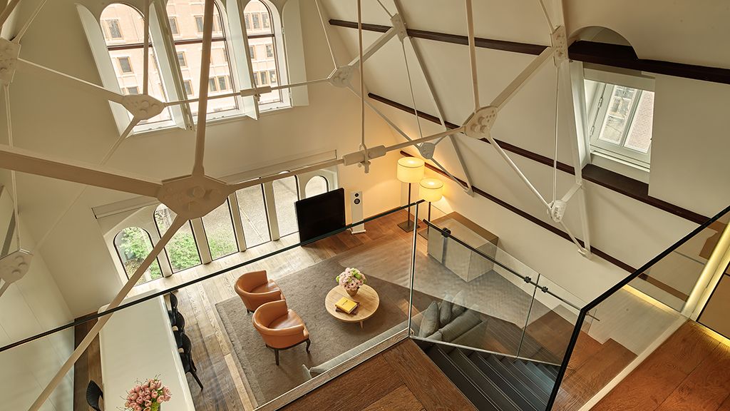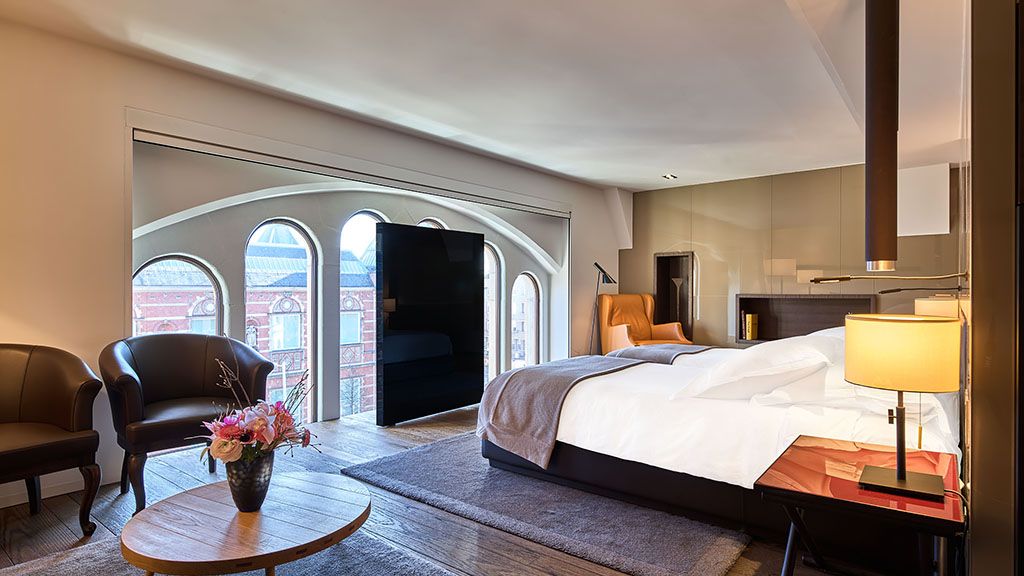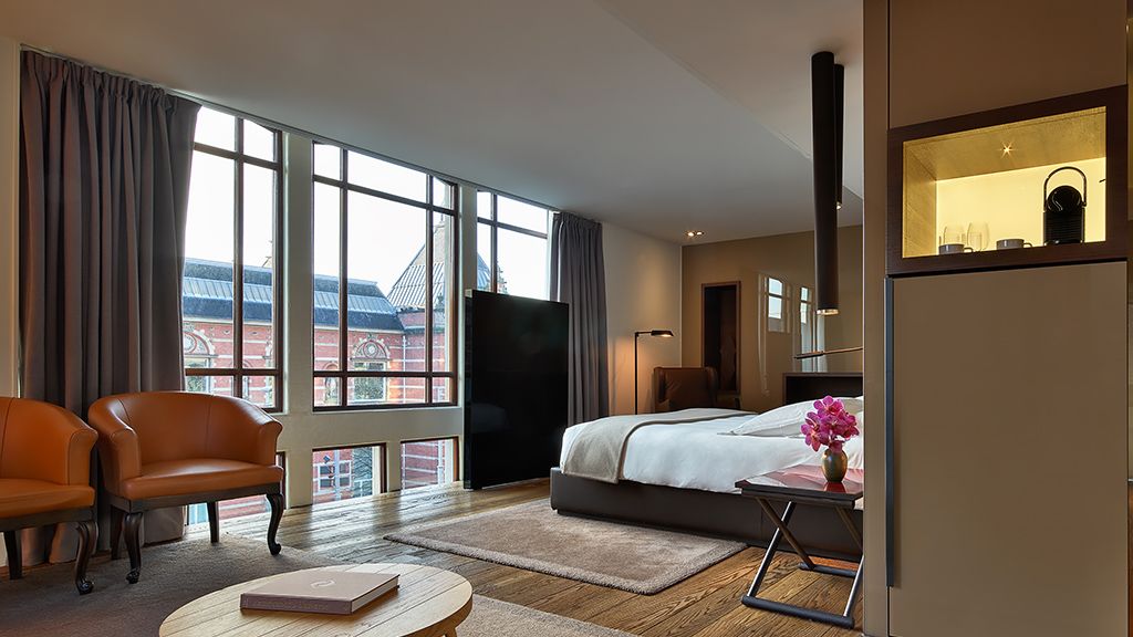 This expansive loft-like suite is filled with natural daylight and offers a king bed and views of the Stedelijk Museum and hotel courtyard through historical arched windows.