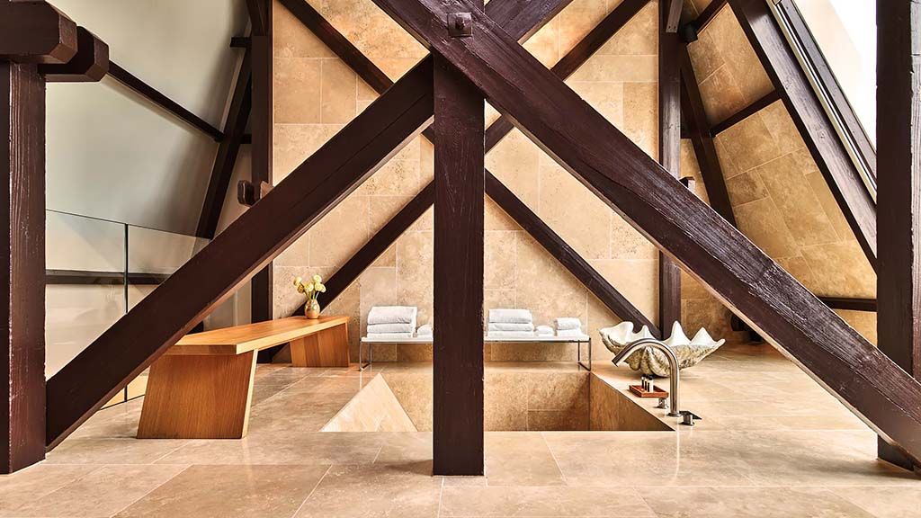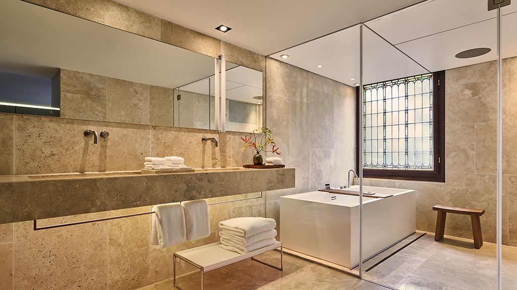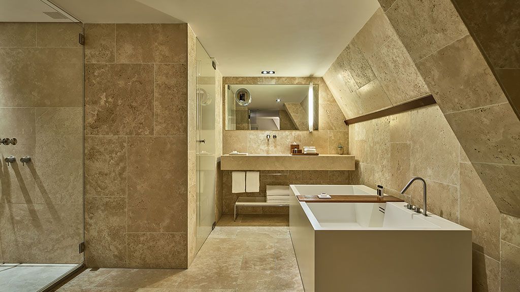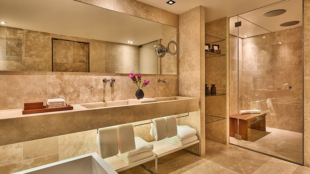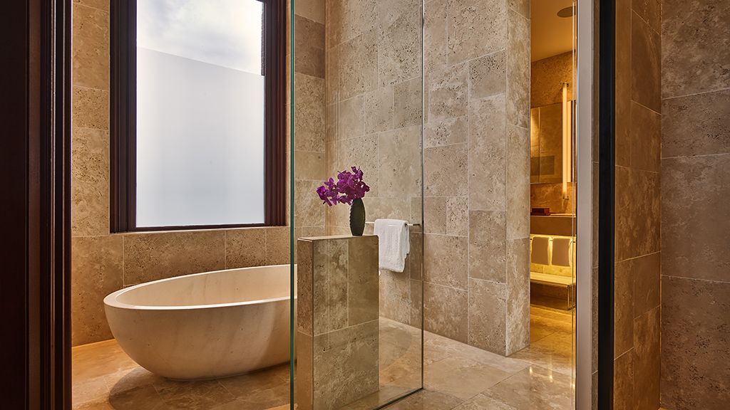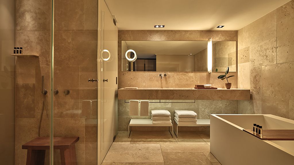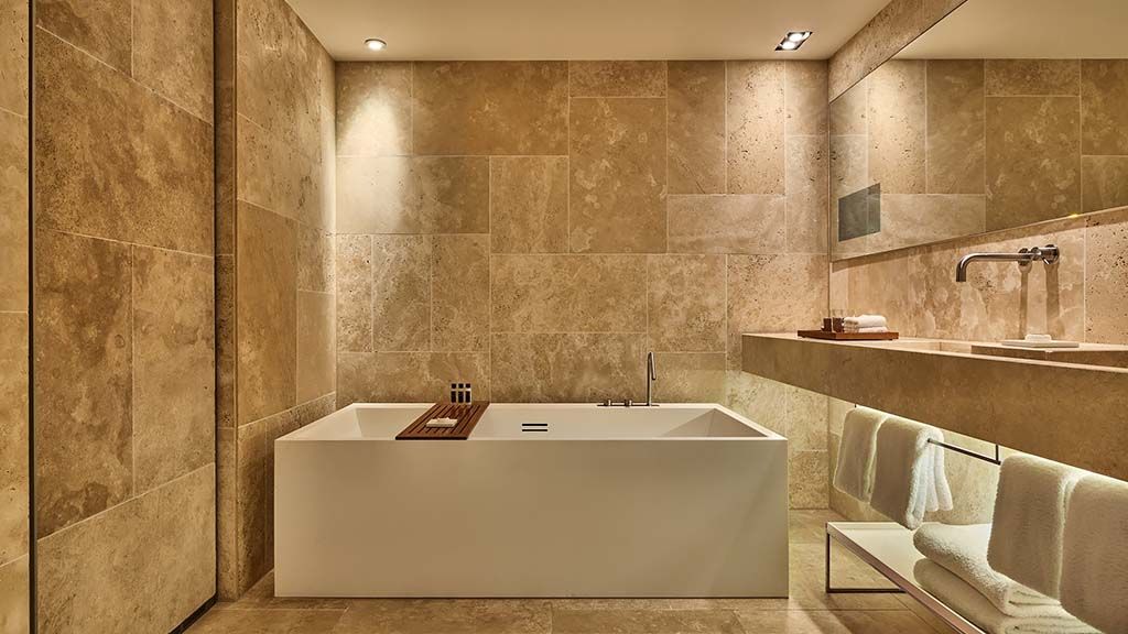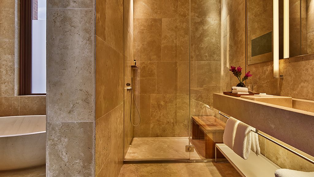 Luxurious living awaits with city views and contemporary décor in natural tones. Each room is designed for ultimate comfort. The travertine stone bathroom features a large rainfall shower and a deep soak bathtub (on request).