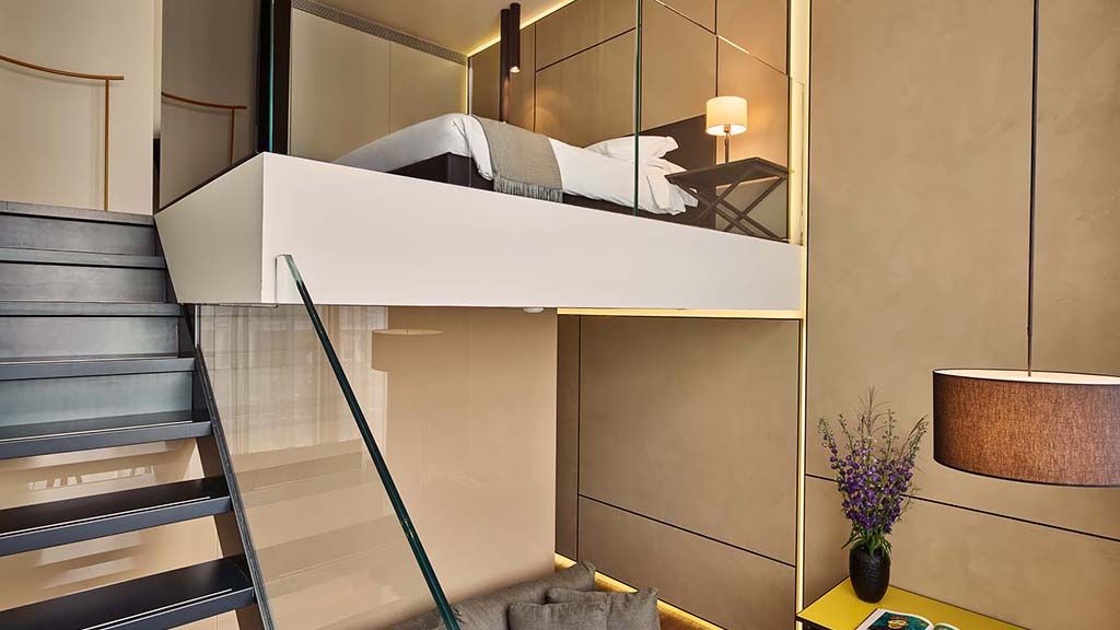 Thoughtfully designed to create a luxurious and relaxing ambience, these split-level rooms feature contemporary décor in natural tones, dark hardwood floors and a lower-level lounge area with a workspace.