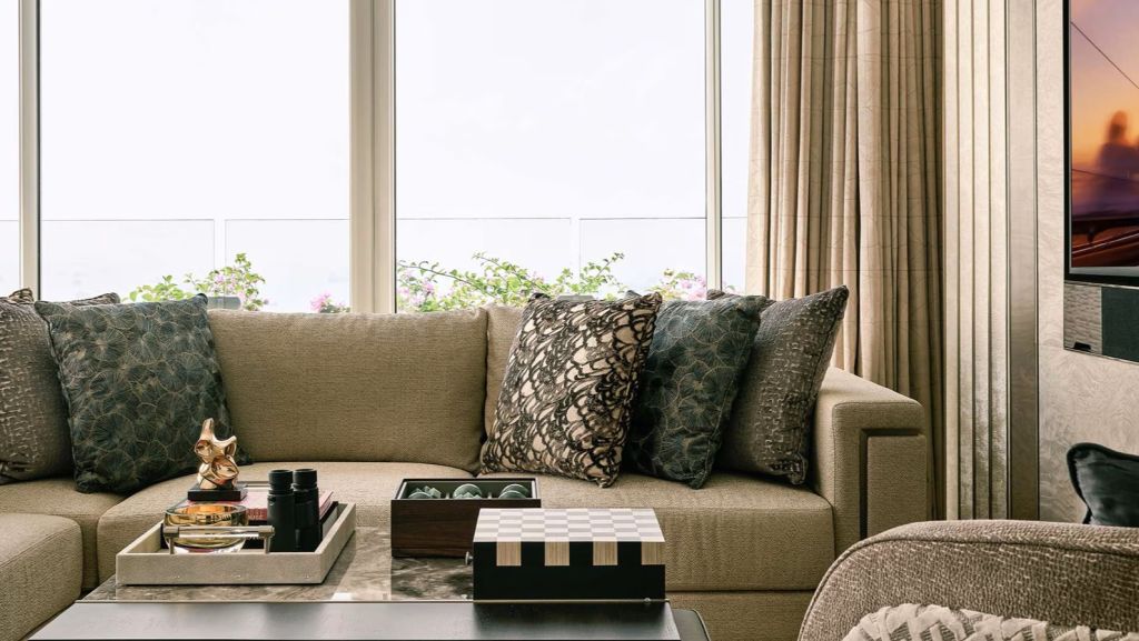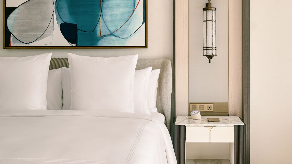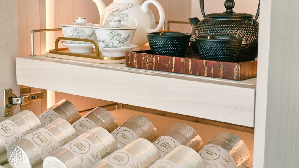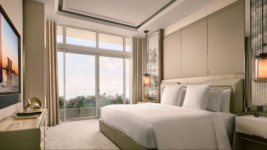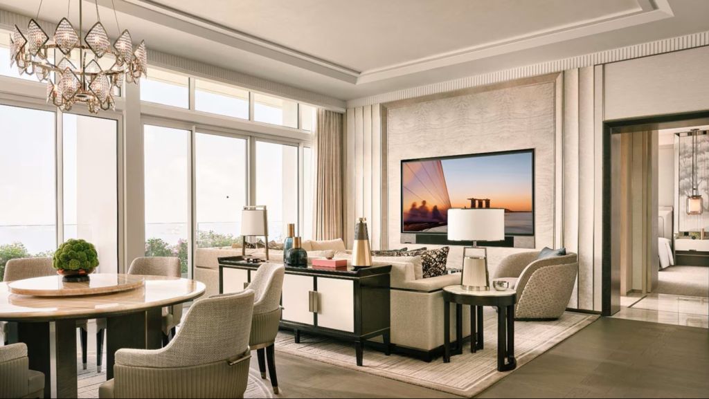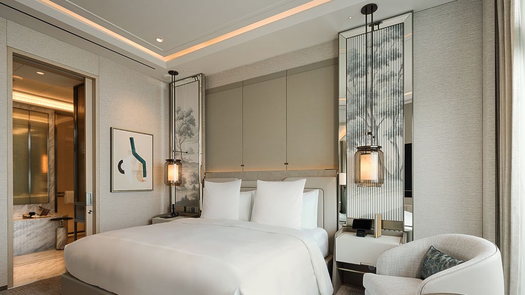 Lounge comfortably on the plush 2-seater sofa in your elegant room, equipped with a 75” tv and integrated with smart technology. The bespoke armoire and cocktail trolley are well-stocked with artisanal tea, international snacks and an extensive selection of wine, beer and soda, along with pre-mixed cocktails. Freshen up in the spacious bathroom, fitted with a luxurious bathtub, rain shower and separate vanities for extra privacy. The generously sized walk-in wardrobe makes dressing up an indulgent affair.
