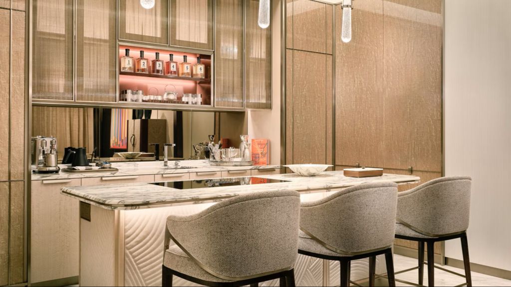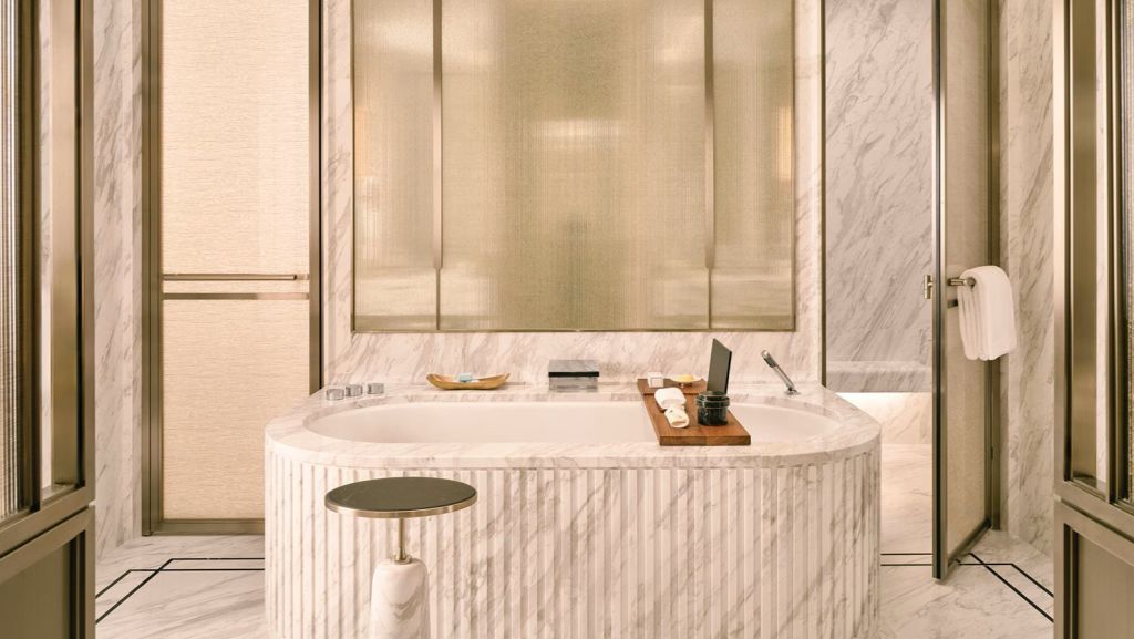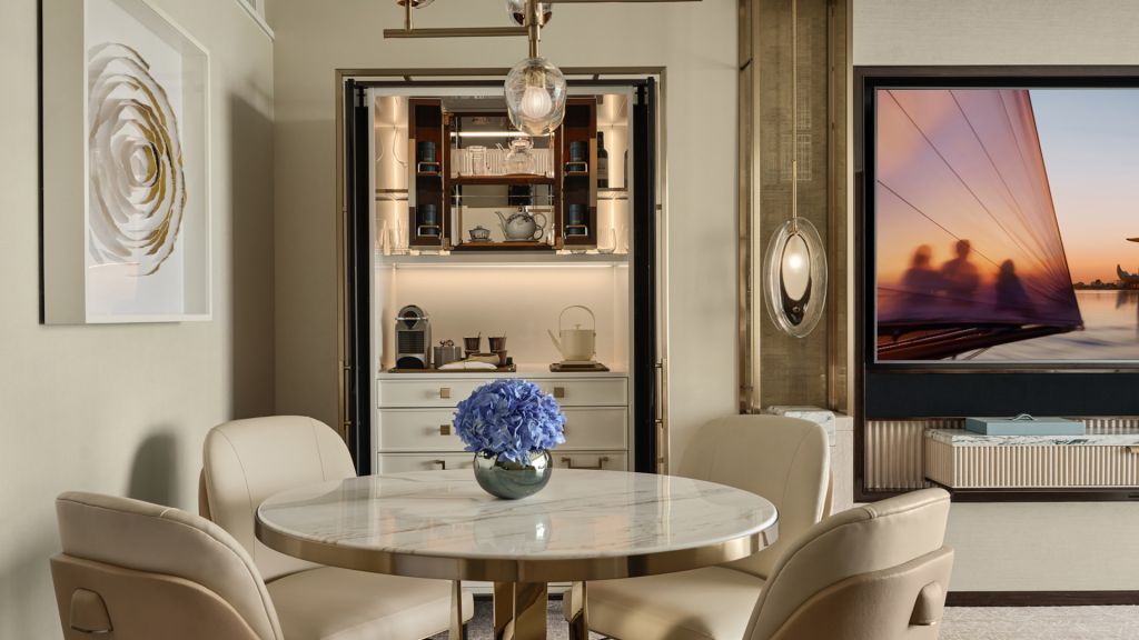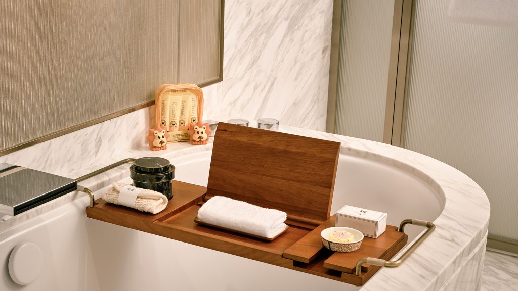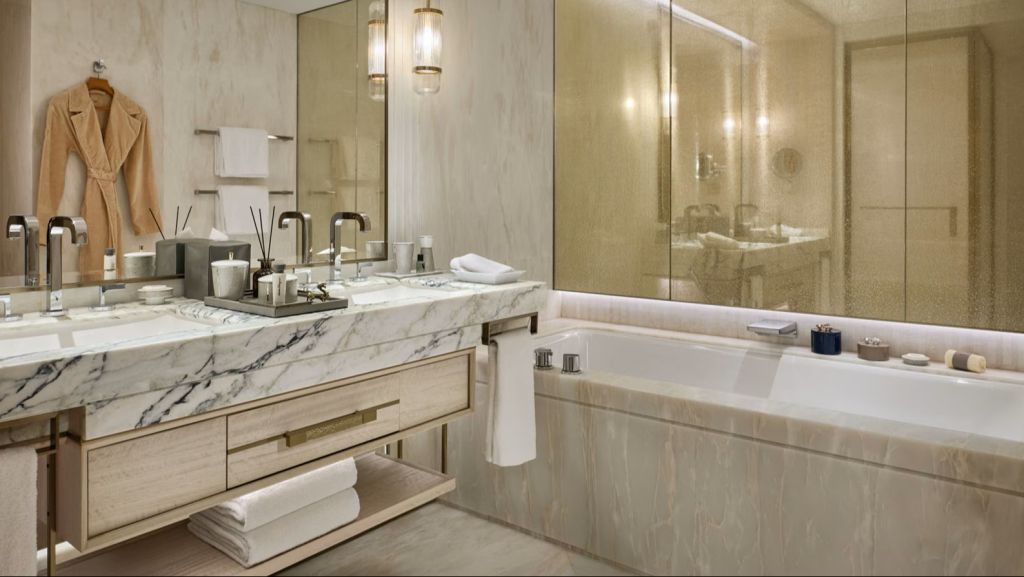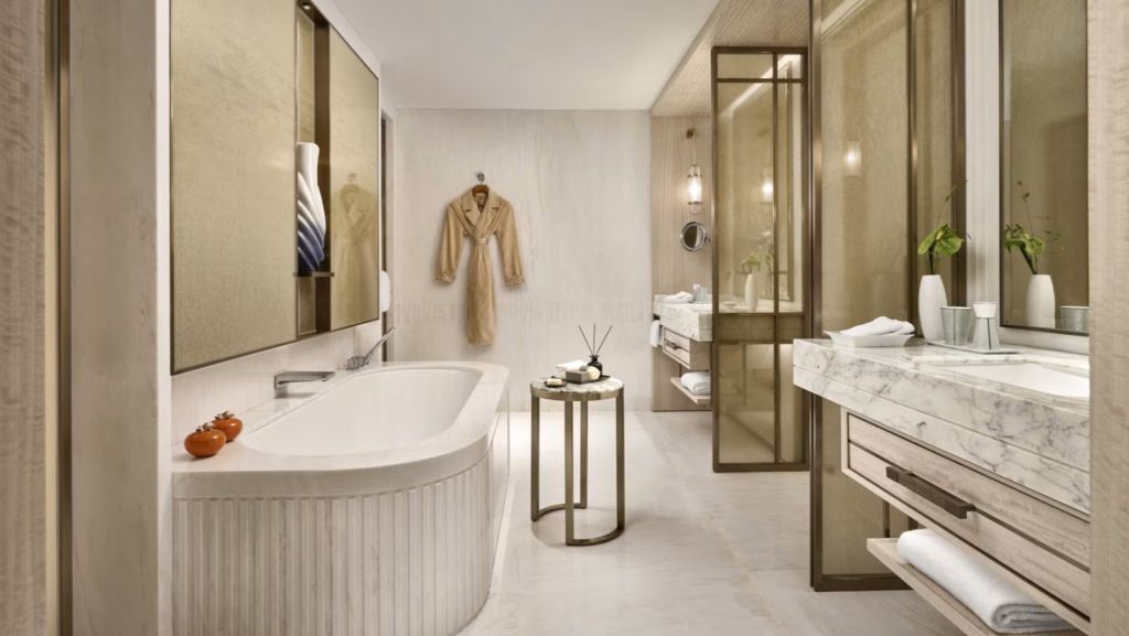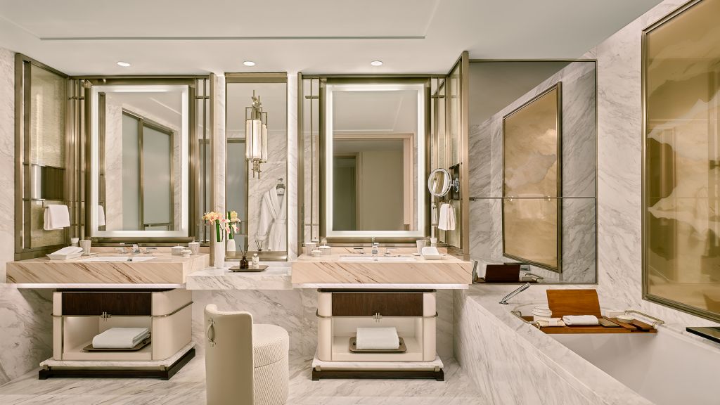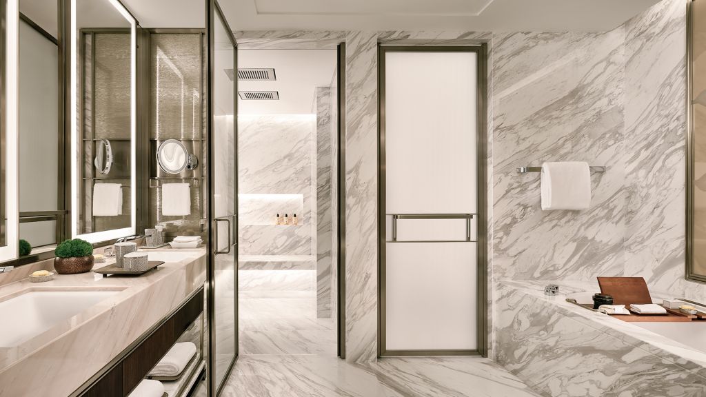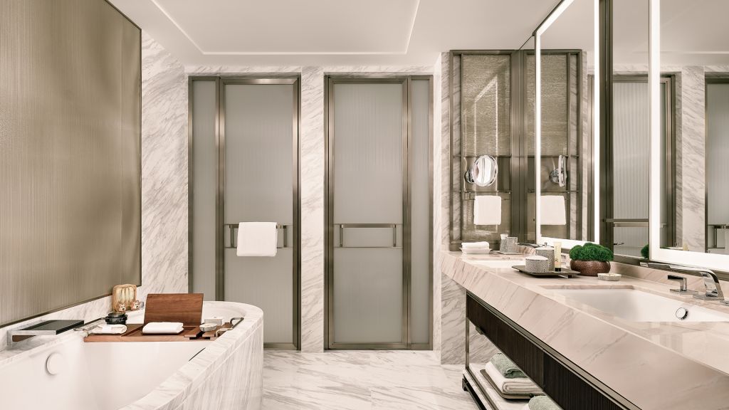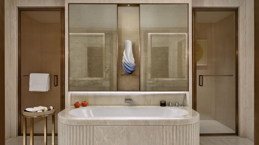 Unwind in your elegant room, equipped with a 75” tv and integrated with smart technology. The bespoke armoire and cocktail trolley are well-stocked with artisanal tea, international snacks and an extensive selection of wine, beer and soda, along with pre-mixed cocktails. Freshen up in the spacious bathroom, fitted with a luxurious bathtub, rain shower and separate vanities.