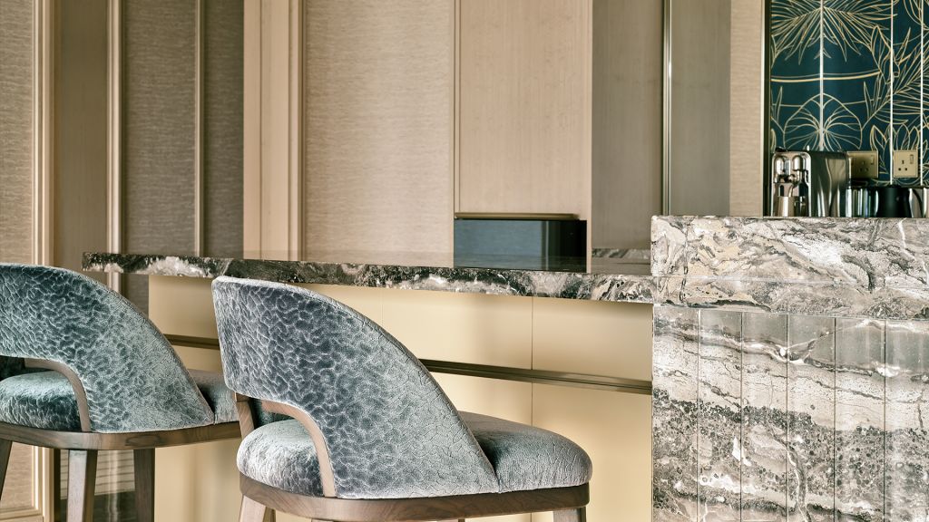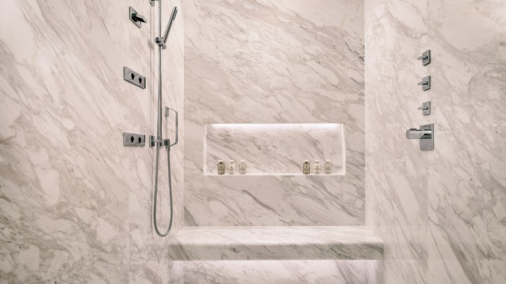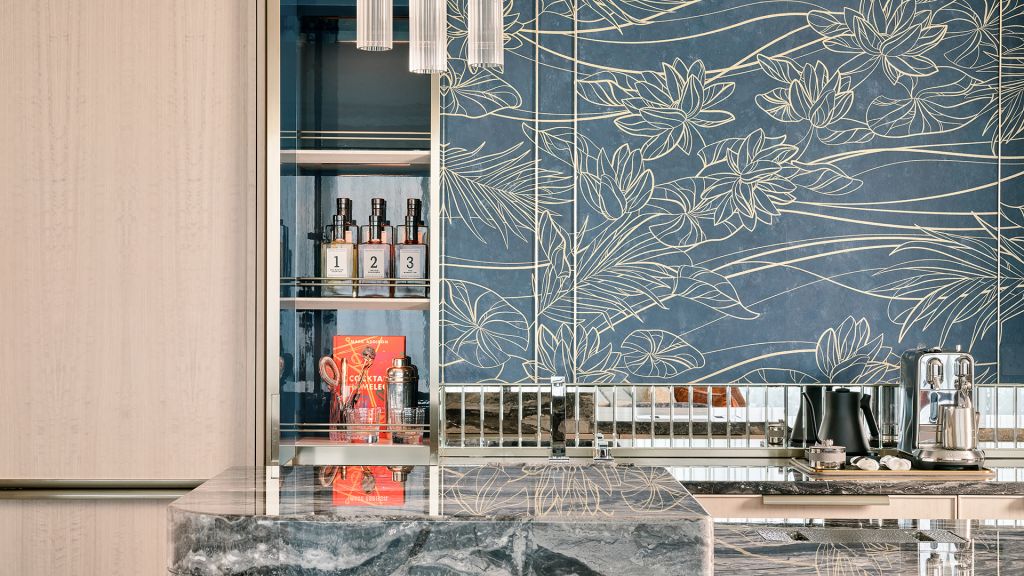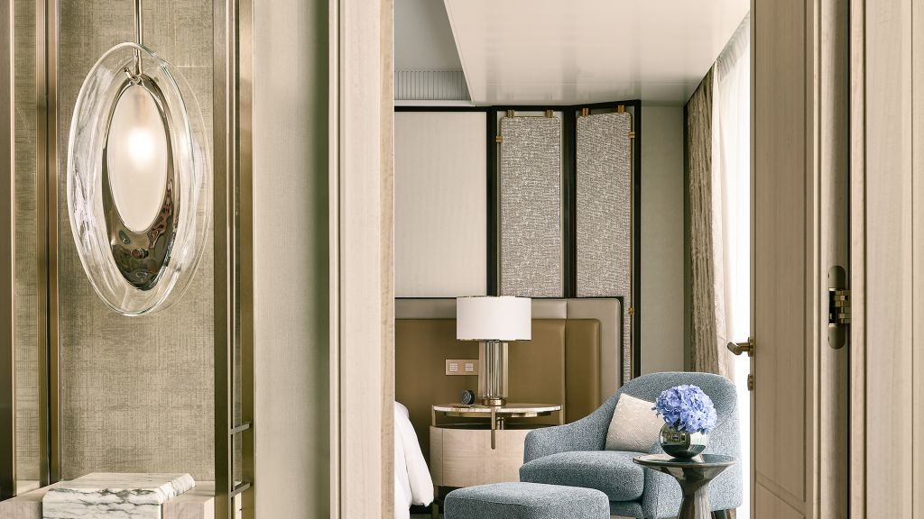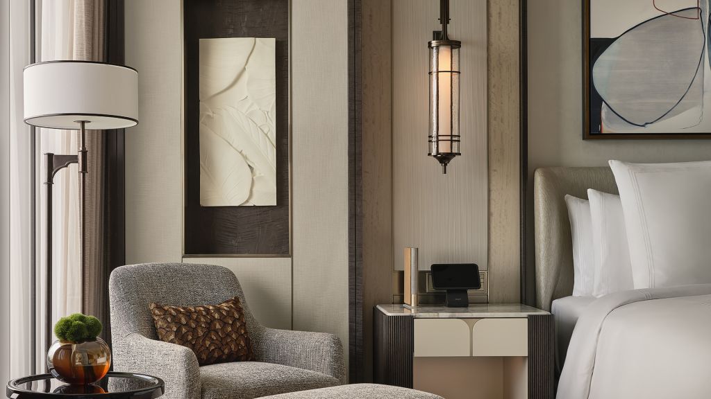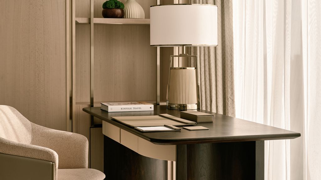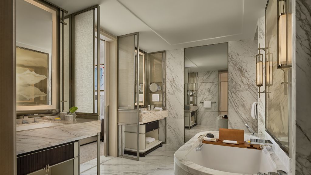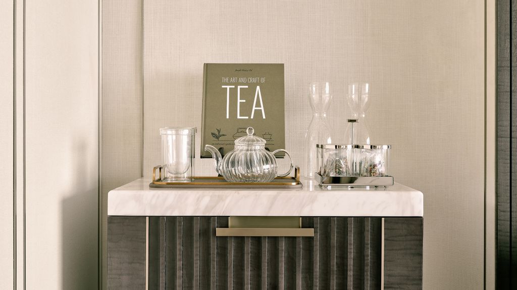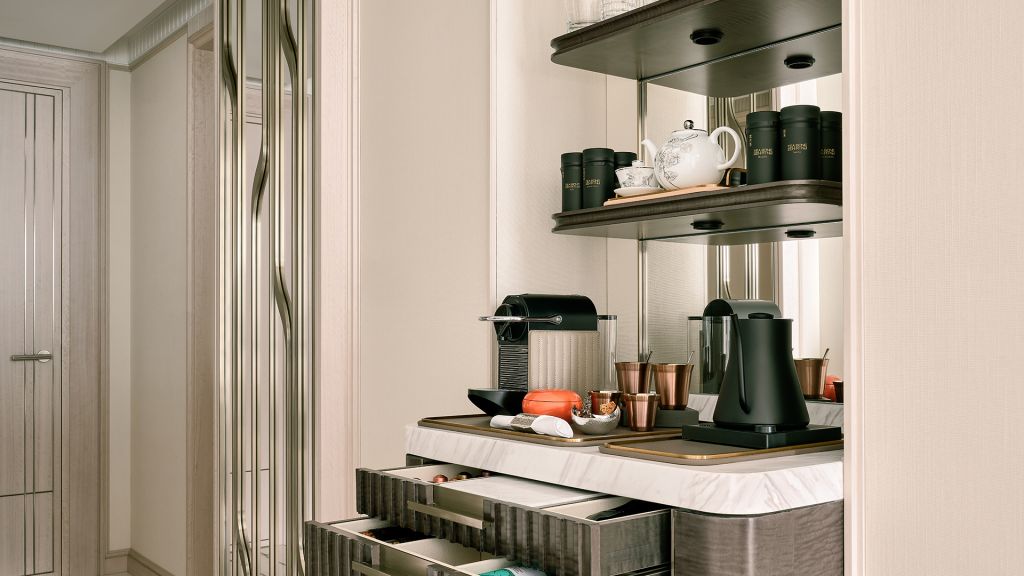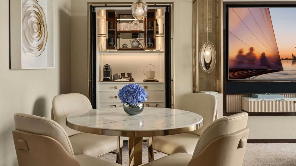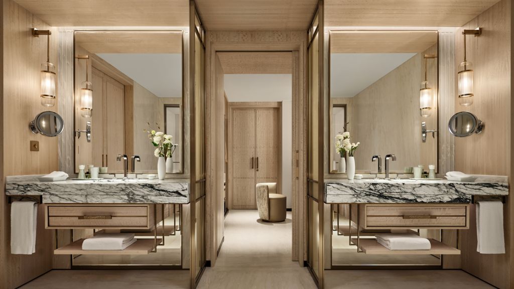 Unwind in your elegant room, equipped with a 75” tv and integrated with smart technology. The bespoke armoire and cocktail trolley are well-stocked with artisanal tea, international snacks and an extensive selection of wine, beer and soda, along with pre-mixed cocktails. Freshen up in the spacious bathroom, fitted with a luxurious bathtub, rain shower and separate vanities.
