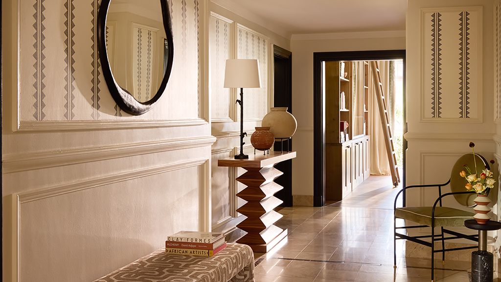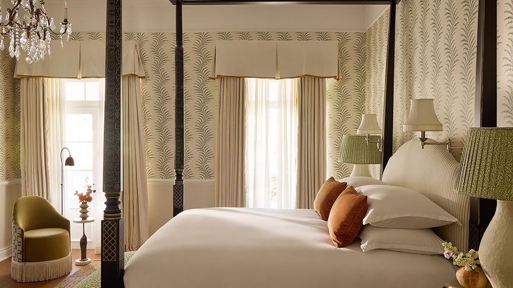 Suite with two king beds, pool view, verandah, kitchenette, dining, fireplace and fine art.