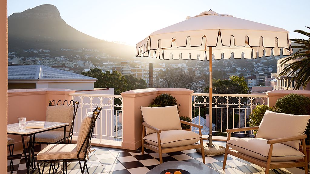 Suite with king bed, balcony, Table Mountain and Lions Head views, kitchenette, wet bar.