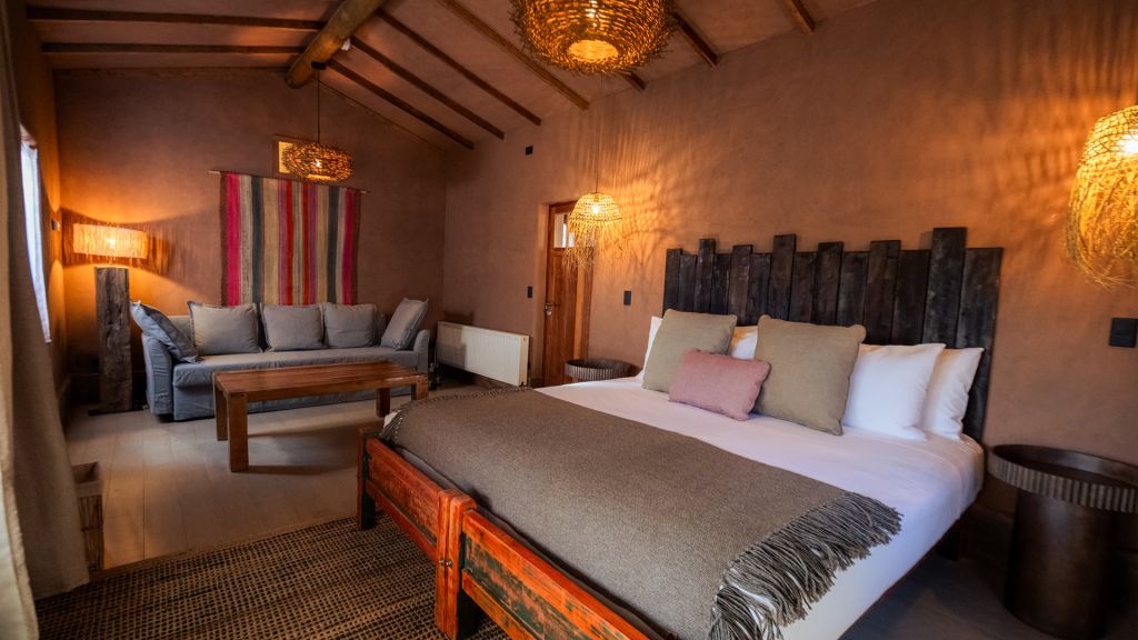Our explorer suite is our large-sized room category ranging from 28 to 34 sq. Meters, offering a retreat for intrepid travelers seeking more space. Our minimalist suites feature earth-toned colors and curated local art objects, lounge chair with a side table, closet and minibar. The layout and design of each of our rooms is unique, and room photos are for reference only. Kindly note that our habitas atacama has limited parking onsite, and overflow parking is available on the street in close proximity to our home. All rates are based on double occupancy, with a maximum room capacity of 3 people. Children 12 years and younger may stay in-room with an adult for no additional cost. An additional fee of $50 US Dollars (including taxes) will be charged for children ages 13+.
