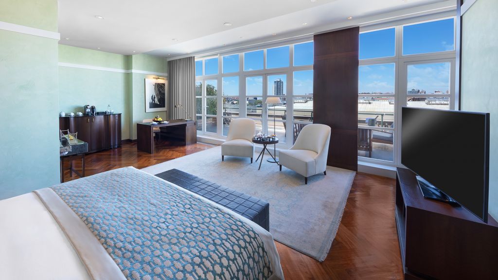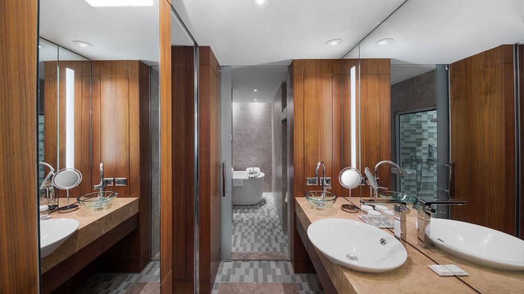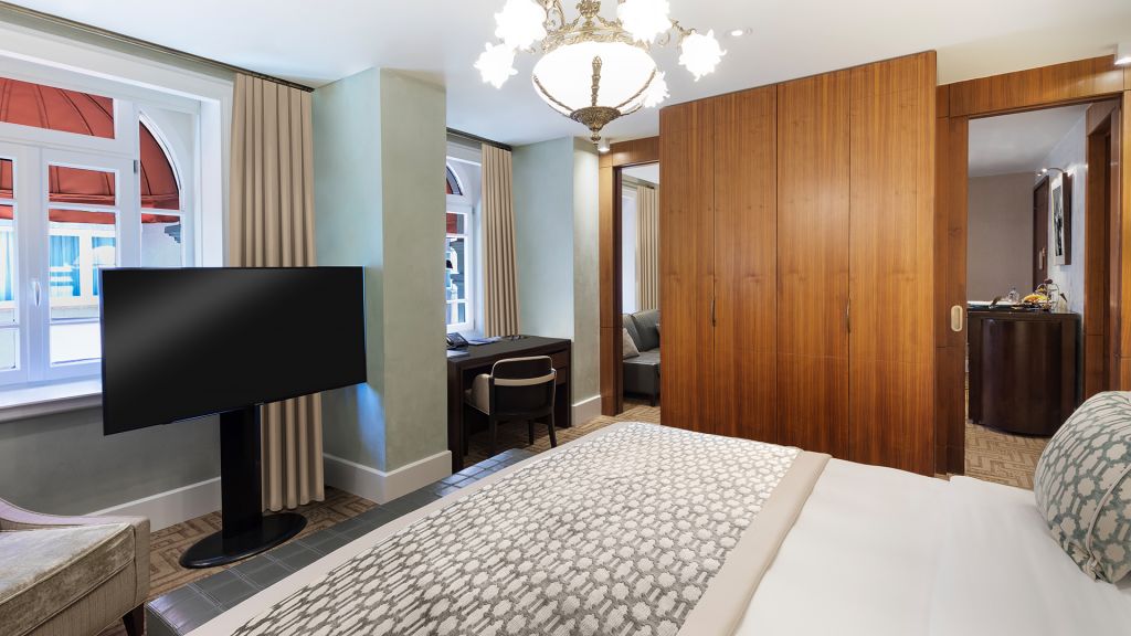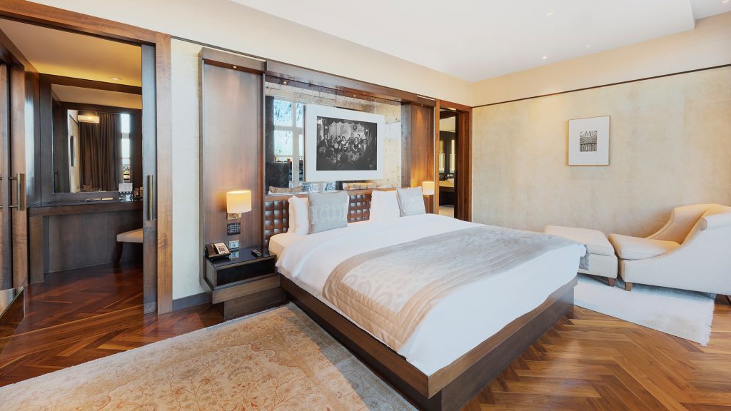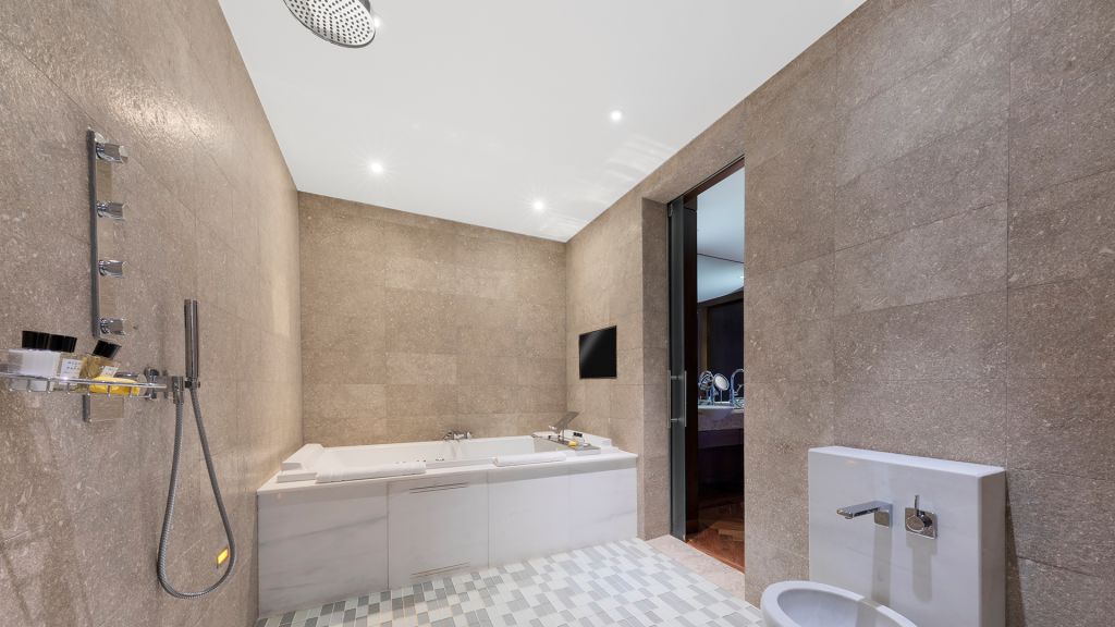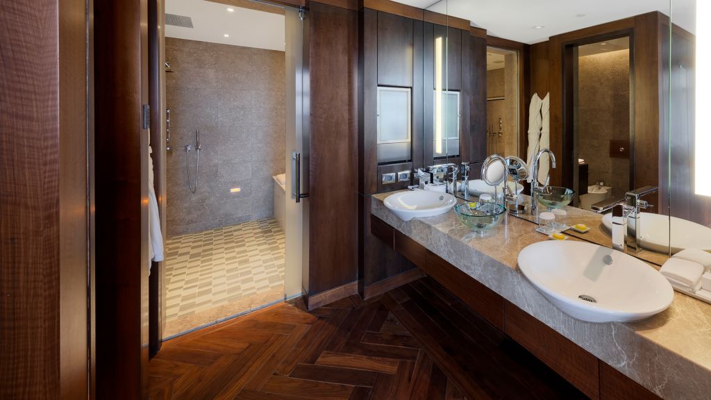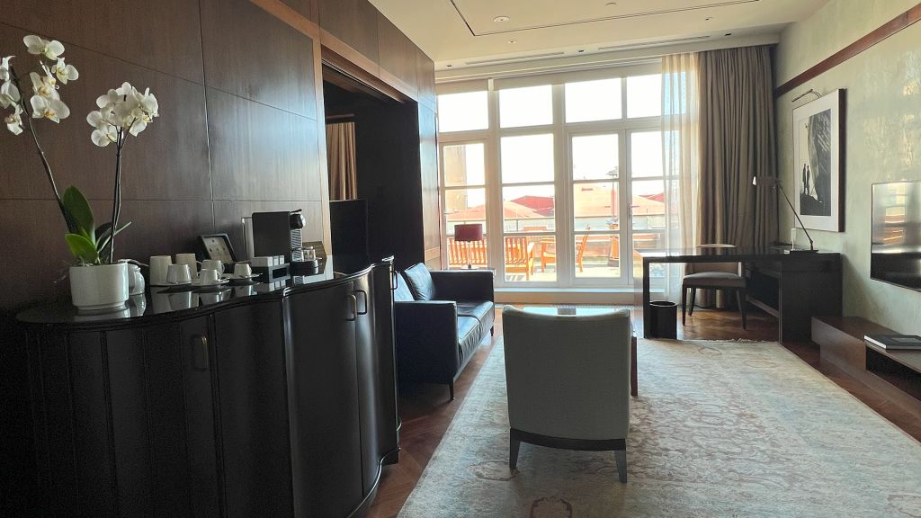 This 8th-floor, 70-square-meter suite is outfitted with a king bed, work desk, minibar, and separate sitting area. The Türkiye’s bath is appointed with a refrigerated cosmetics cabinet, deep soaking tub, and Dornbracht rainfall shower. This is a premium suite.