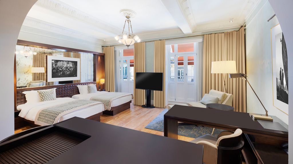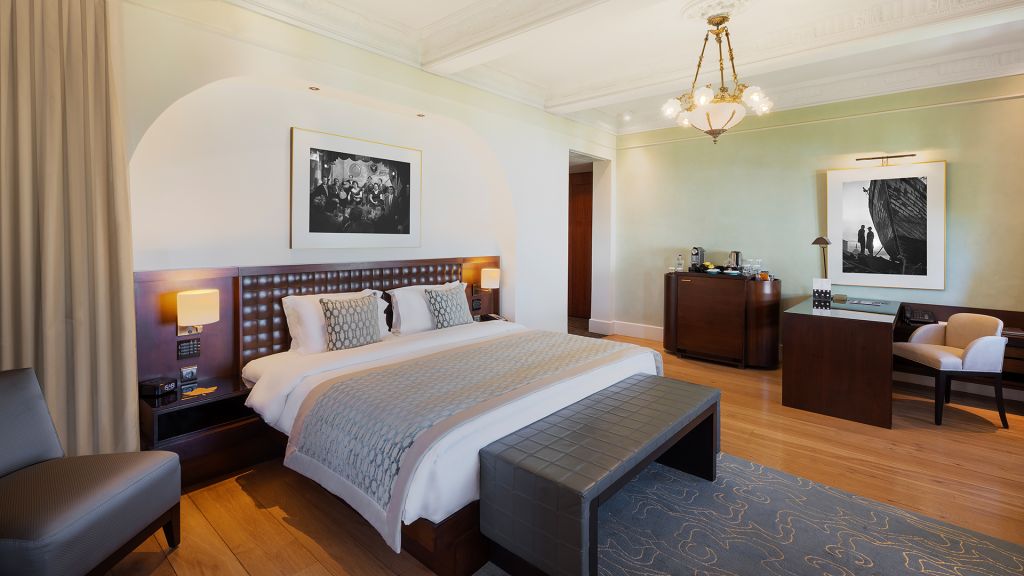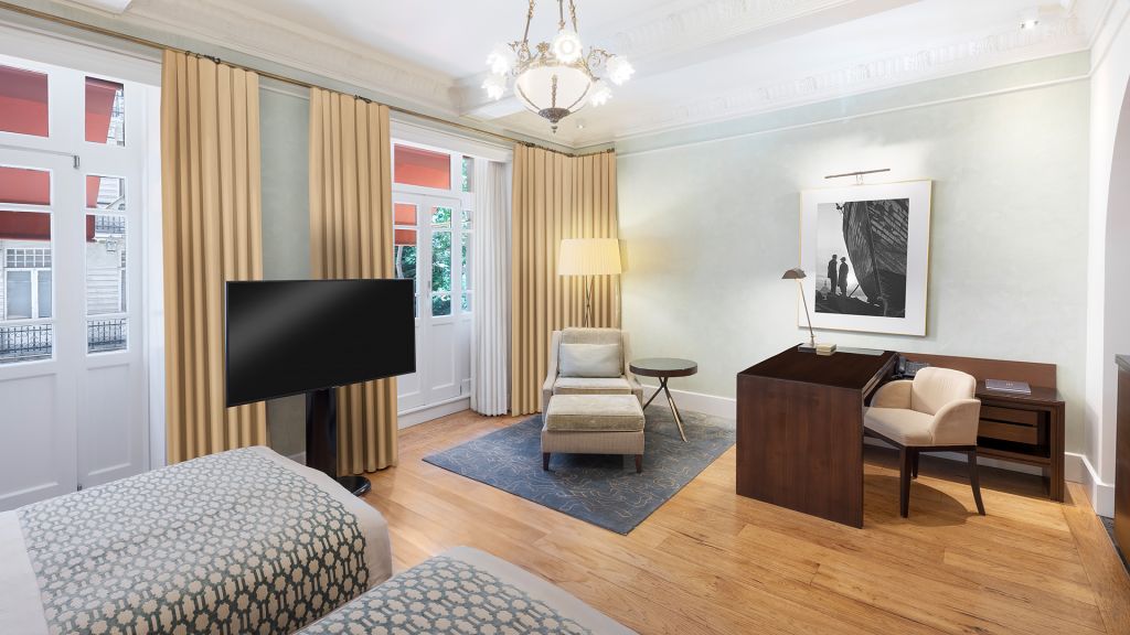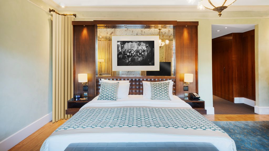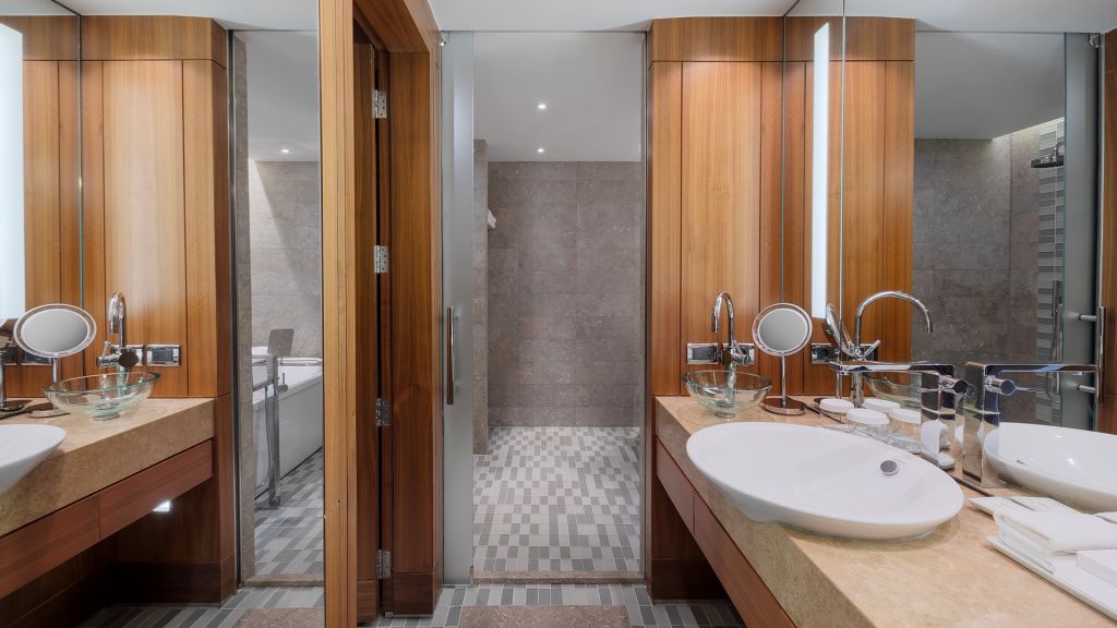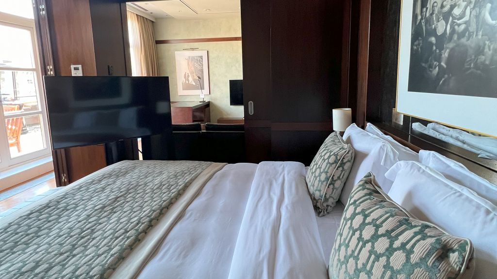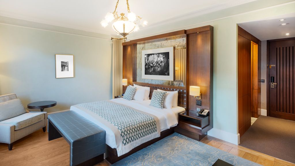 This 8th-floor, 70-square-meter suite is outfitted with a king bed, work desk, minibar, and separate sitting area. The Türkiye’s bath is appointed with a refrigerated cosmetics cabinet, deep soaking tub, and Dornbracht rainfall shower. This is a premium suite.