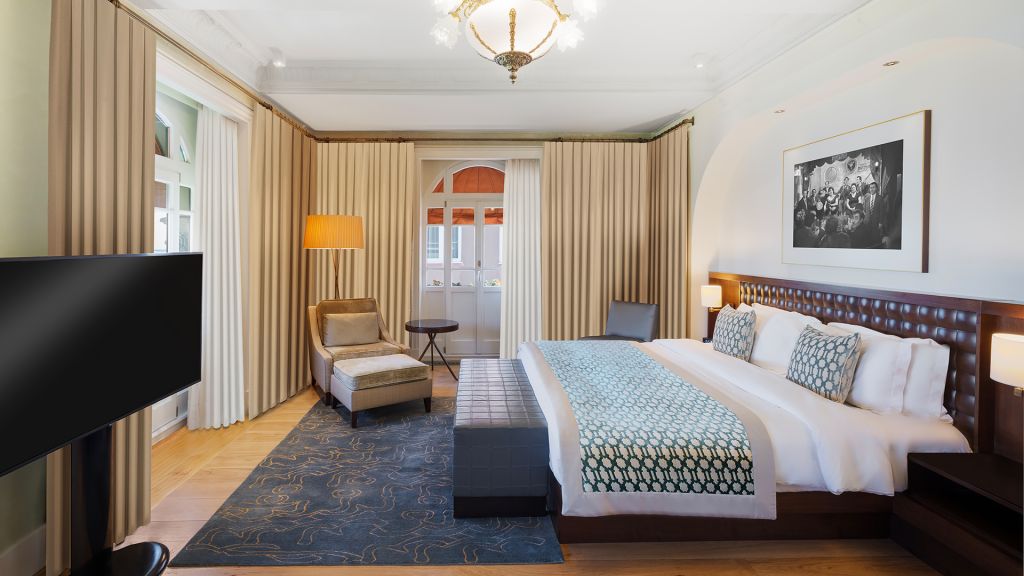 This 38- to 41-square-meter room offers a king bed, work desk, French balcony with city views, minibar, a deep soaking tub, and Dornbracht shower.