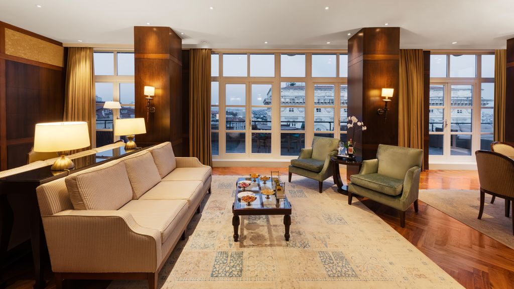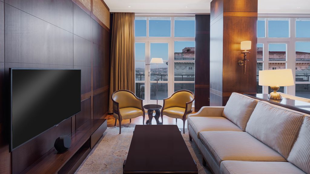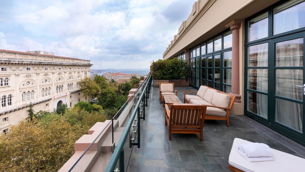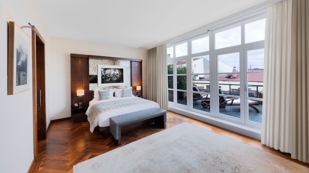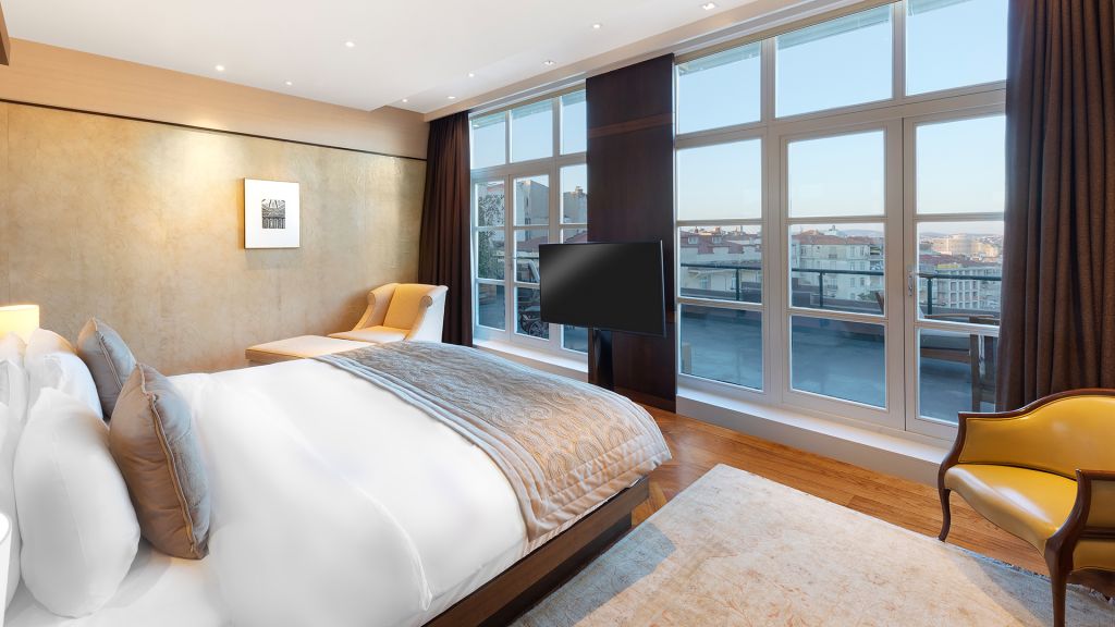 This luxurious 100-square-meter suite boasts a king bed, work desk, separate living area, guest bath, minibar, and a rooftop terrace with Bosporus views. An elegantly appointed Türkiye’s bath features a full vanity, deep soaking tub, and Dornbracht rainfall shower. This is a premium suite.