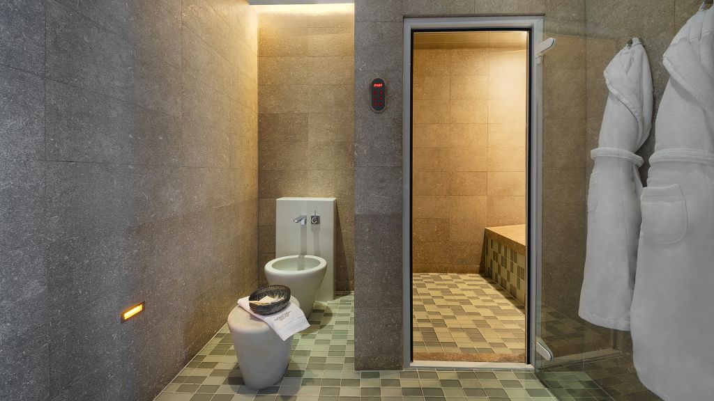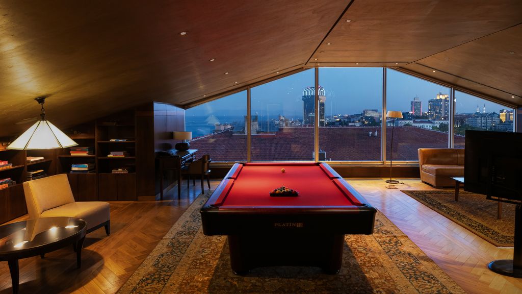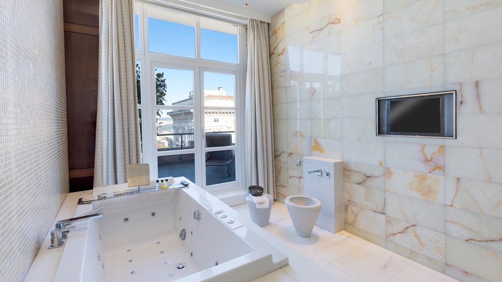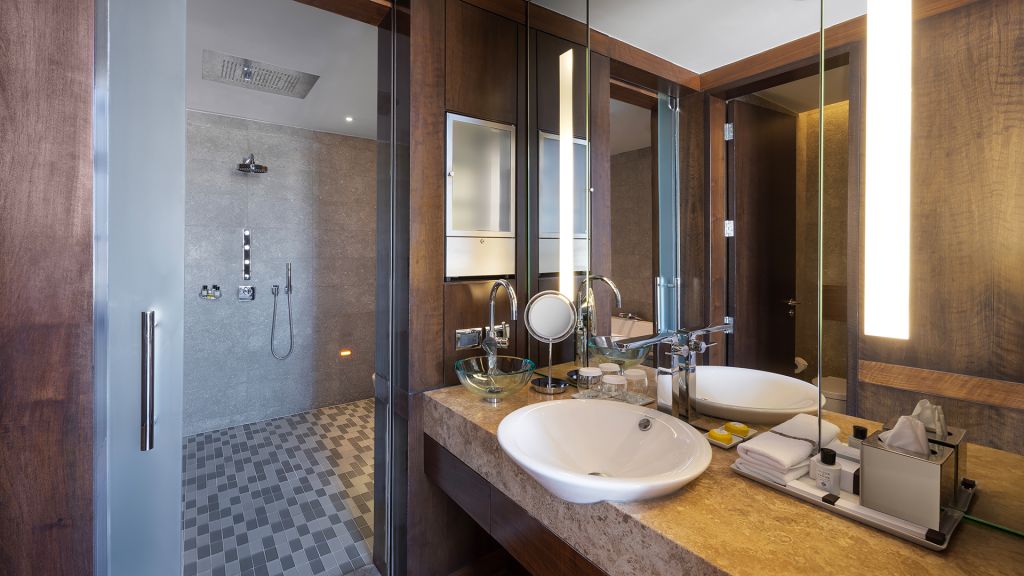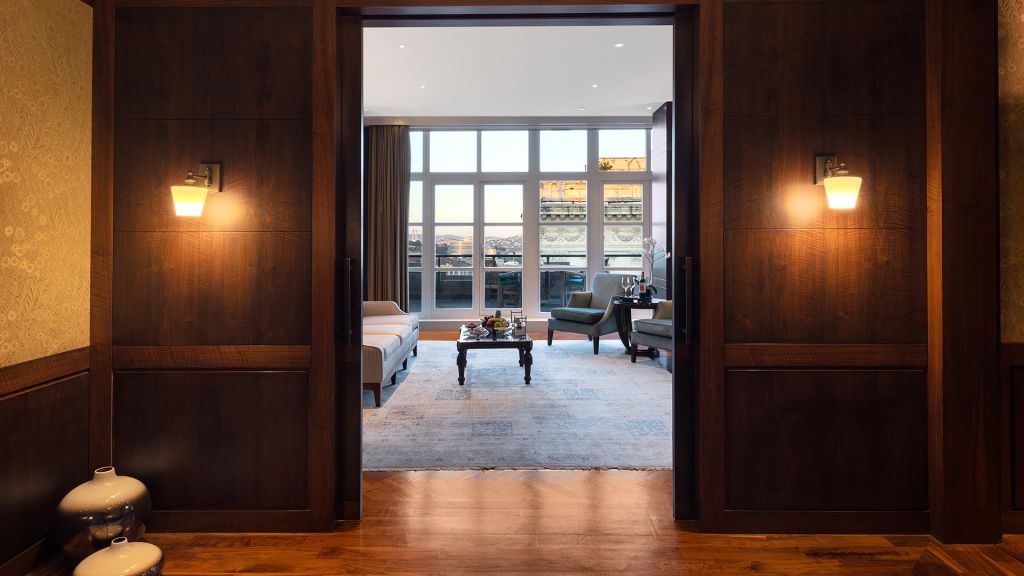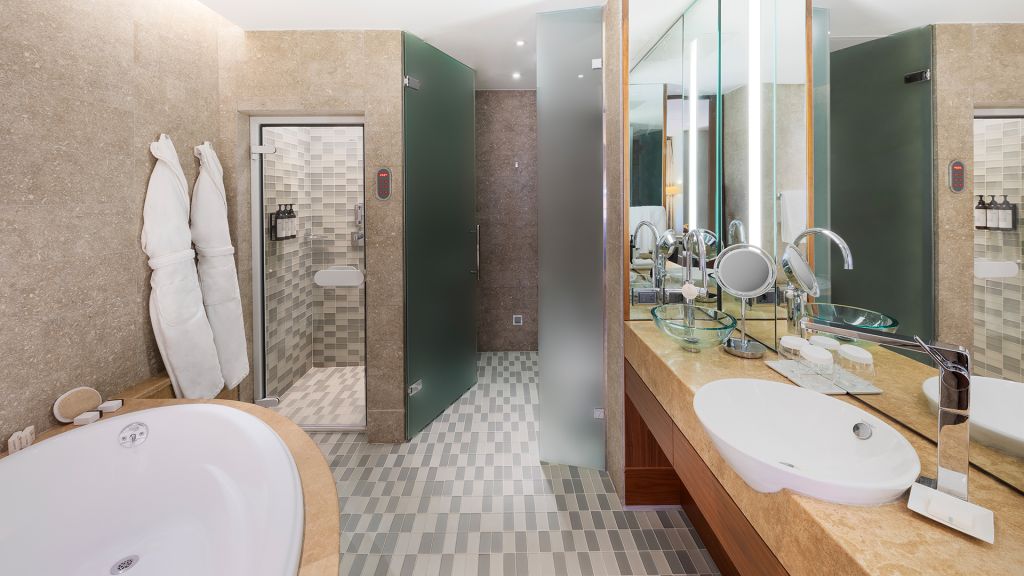 This luxurious 100-square-meter suite boasts a king bed, work desk, separate living area, guest bath, minibar, and a rooftop terrace with Bosporus views. An elegantly appointed Türkiye’s bath features a full vanity, deep soaking tub, and Dornbracht rainfall shower. This is a premium suite.