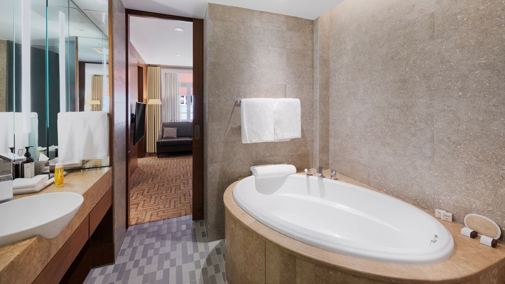 Inside this 44 to 66-square-meter room, you’ll find a king bed, work desk, French balcony with city views, a steam room, and a deep soaking tub.