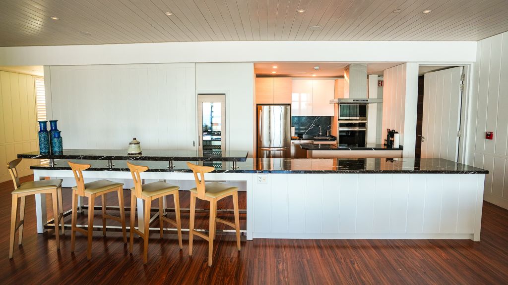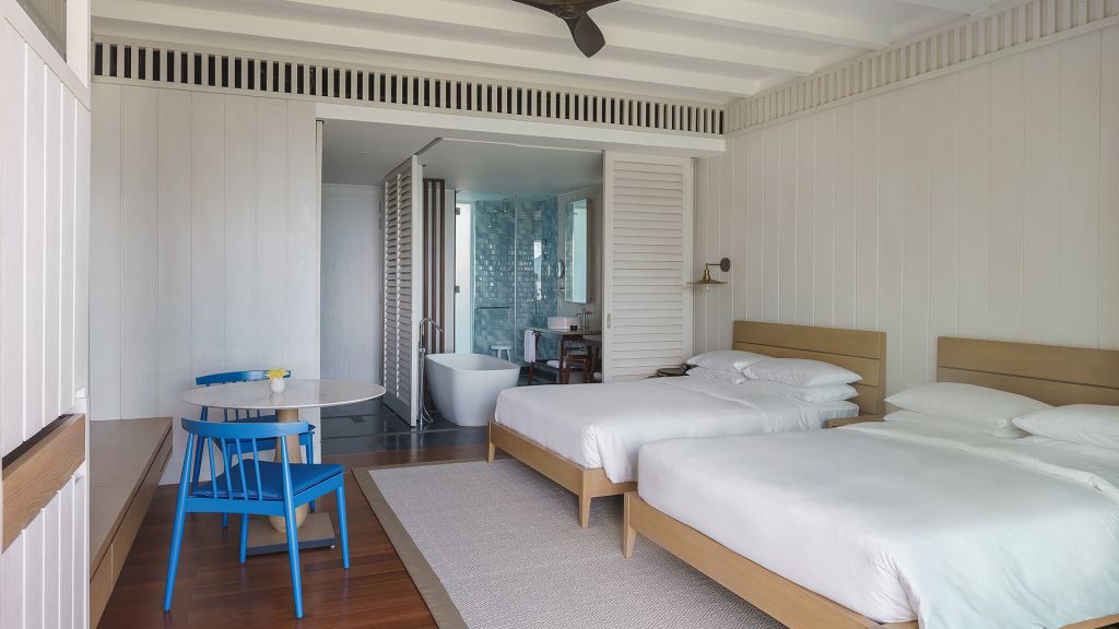 The three-bedroom two-story 5,280-square-foot Presidential Villa features private decks and a pool at 2,250 square feet. The villa offers one bedroom with two queen beds and two bedrooms with a king bed in each, plus a game room, wellness area and private infinity pool.
