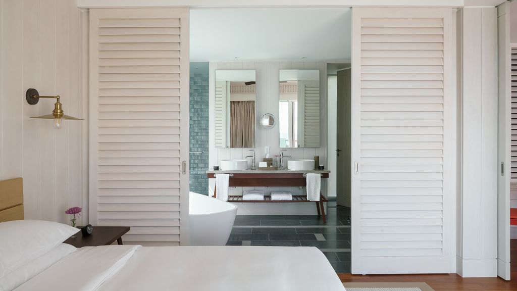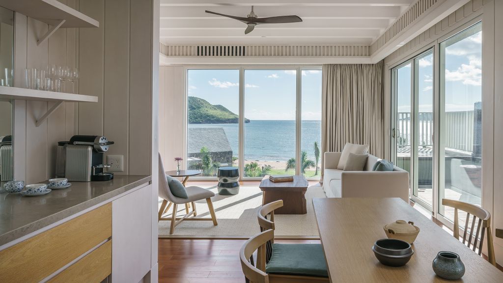 Revel in 725 square feet with an additional private deck of 615 square feet. One king bed, deep soaking tub, and private plunge pool and terrace. Floor-to-ceiling windows frame sea and mountain views.