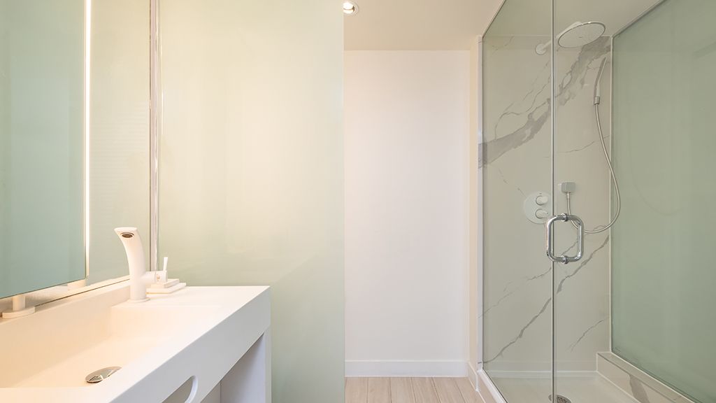 The Ocean View Queen features two Signature SLS Queen Beds and floor-to-ceiling sliding glass doors to a full balcony with stunning ocean views. The bathrooms contain spacious showers, oversized vanities, and Ciel Reserve amenities.