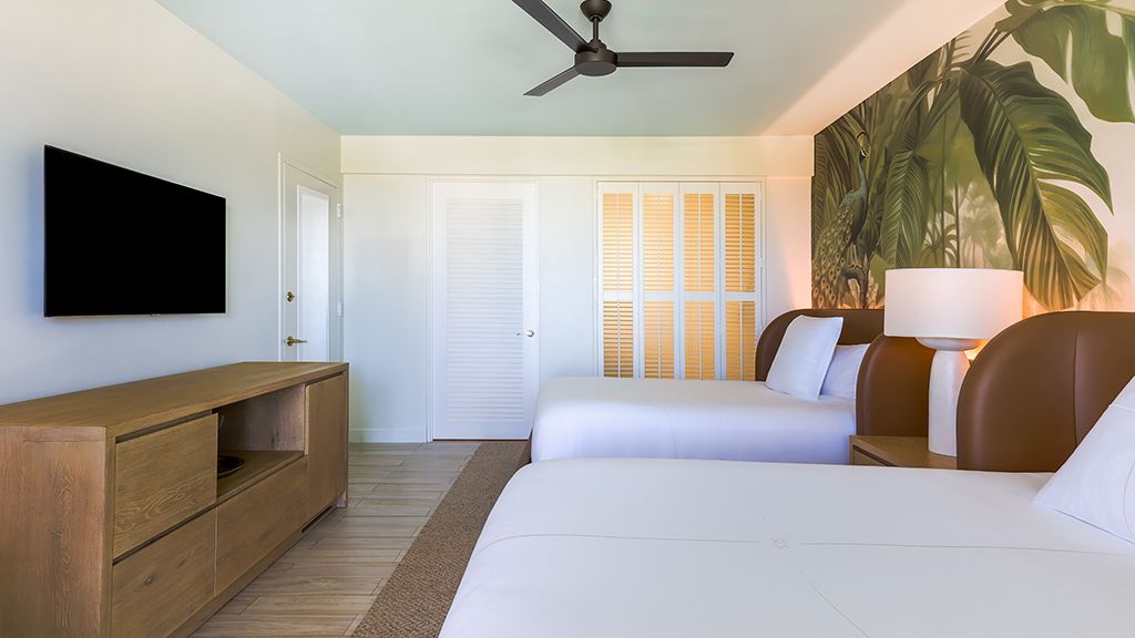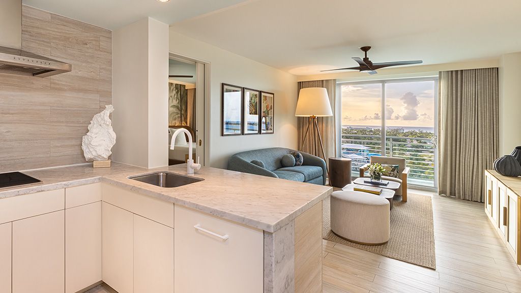 The Ocean View Two Bedroom Residence features one room with a king bed and ensuite bathroom, one with two queen beds and an ensuite bathroom, a living room area with a kitchenette and floor-to-ceiling glass doors.