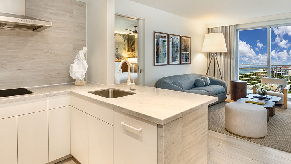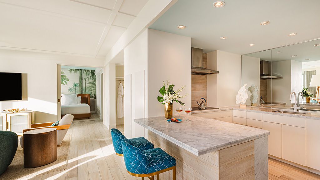 The luxurious, 716 square foot Superior Suite sleeps up to three guests in our Signature SLS King bed. Featuring step-out balconies, a living room area with 55" HD TV, mini bar curated with SLS Signature items, and an elegant designer kitchen.