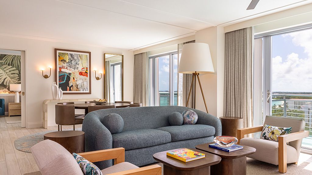 Ocean View Two Bedroom Suite features one Signature SLS King Bed and two Signature SLS Queen Beds, a living room area with a designer kitchenette, and floor to ceiling sliding glass doors to a walkout balcony with a stunning ocean view. Guests will also enjoy luxurious MALIN+GOETZ for Ciel Spa bath amenities throughout their stay.