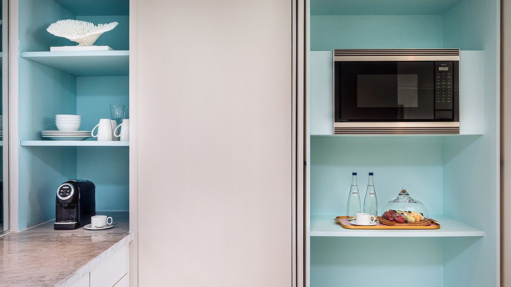 The Ocean View One Bedroom Residence features one Signature SLS King Bed, a living room area with a designer kitchenette, and. floor to ceiling sliding glass doors to a Juliette balcony with stunning ocean and resort views