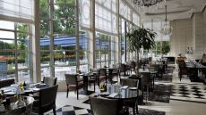 Contemporary room overlooking the hotel garden.